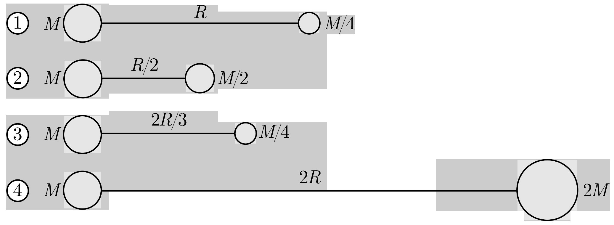 Считая, что сила взаимодействия двух тел одинаковых масс M, находящихся на расстоянии R друг от друга, равна F0. Определите, для какой пары тел сила гравитационного взаимодействия равна F0/2?