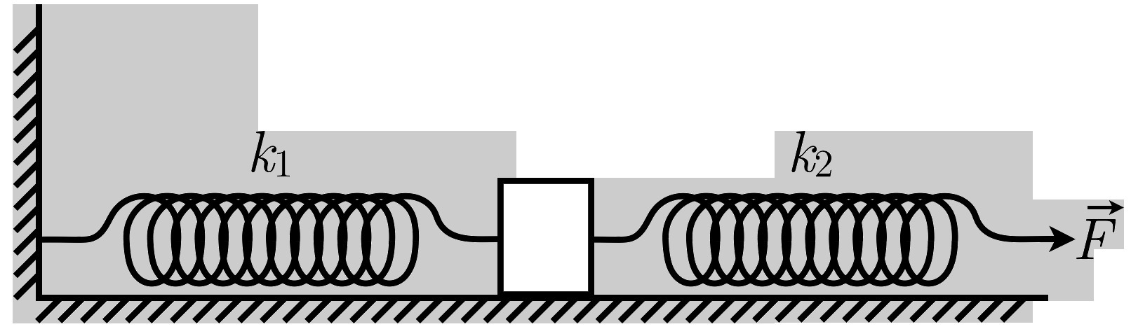 К системе из кубика массой m=1 кг и двух пружин приложена постоянная горизонтальная сила F. Система покоится. Между кубиком и опорой трения – нет. Левый край первой пружины прикреплён к стенке. Удлинение первой пружины равно x1=2 см. Вторая пружина растянута на x2=3 см. Жёсткость первой пружины k1=360 Н/м.