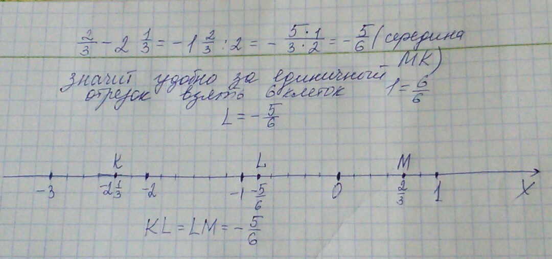Изобразите координатную ось, выбрав удобный единичный отрезок отметьте на оси точки с координатами О (0), М (2/3), К (-2 1/3). Вычислите координату середины отрезка МК