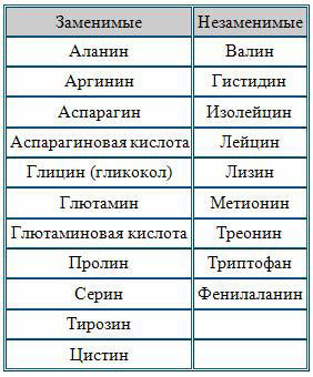 Заменимые аминокислоты – это те, которые в процессе метаболизма могут создаваться из других аминокислот и питательных веществ, поступающих с пищей. К заменимым аминокислотам относятся: Аланин, Аргинин, Аспарагин, Аспарагиновая кислота, Цистеин, Глютаминовая кислота, Глютамин, Глицин, Пролин, Серин, Тирозин.