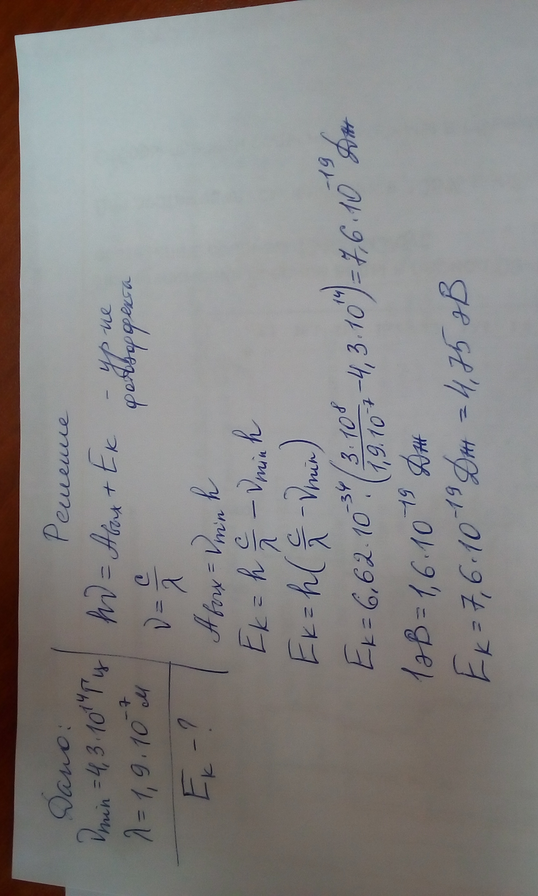 Для некоторого металла красной границей фотоэффекта является свет с частотой 4,3 · 1014 Гц. Определите кинетическую энергию, которую приобретут электроны под действием излучения с длиной волны 1,9 · 10-7 м.