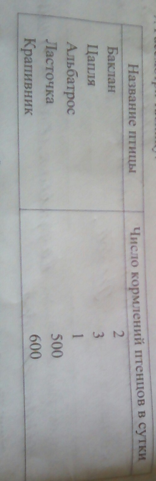 Рассмотри таблицу Пользуясь данными таблицы Ответь на вопросы 1 вопрос во сколько раз в течение суток крапивник вылетает за пищей чаще чем Баклан второй вопрос во сколько раз ласточка вылетает за пищей чаще чем Баклан в течение 4 дней