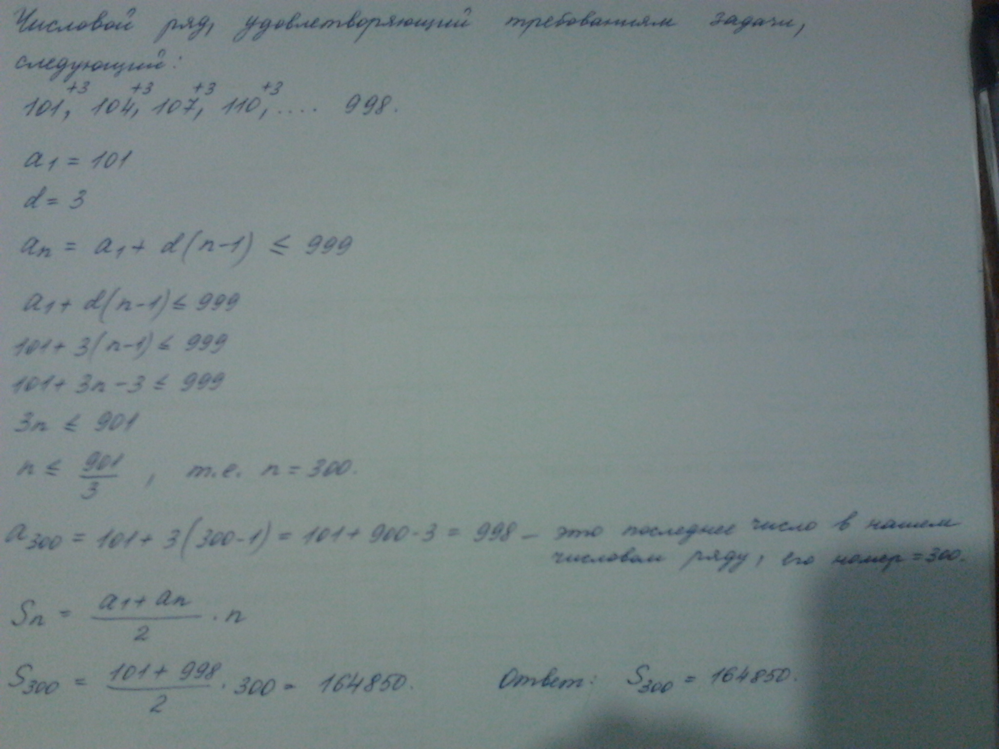 Найти сумму всех трёх значных натуральных чисел, которые при делении на три дают остаток два.