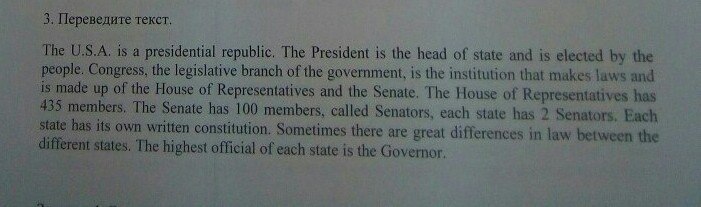 США является президентской республикой. Президент - глава государства, избираемый народом. Конгресс, законодательная ветвь федерального правительства - это организация, издающая законы, которая состоит из Палаты представителей и Сената. В Палате представителей 435 члена. В сенате - 100 членов, называемых сенаторами, по два из каждого штата. Каждый штат имеет собственную формальную (писаную) конституцию. Иногда законы разных штатов сильно различаются. Губернатор является высшим должностным лицом в каждом штате.