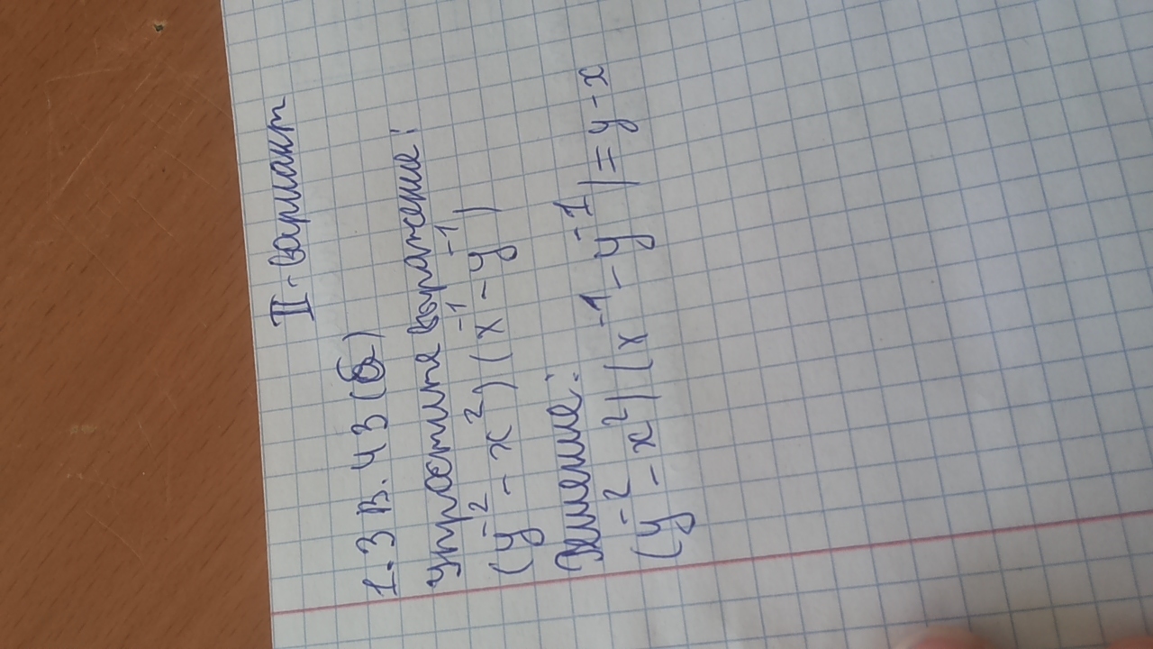 (y^{-2}-x^2)(x^{-1}-y^{-1})=( frac{1}{y^2}-x^2) (frac{1}{x} -frac{1}{y} )=\\=frac{1-x^2y^2}{y^2} cdot frac{y-x}{xy} = frac{(1-xy)(1+xy)(y-x)}{y^3cdot x} \\\(y^{-2}-x^{-2})(x^{-1}-x^{-1})=( frac{1}{y^2} -frac{1}{x^2})( frac{1}{x}-frac{1}{y})=\\= frac{x^2-y^2}{x^2y^2} cdot frac{y-x}{xy} = frac{(x-y)(x+y)(y-x)}{x^3y^3} = frac{-(x-y)^2(x+y)}{x^3y^3}