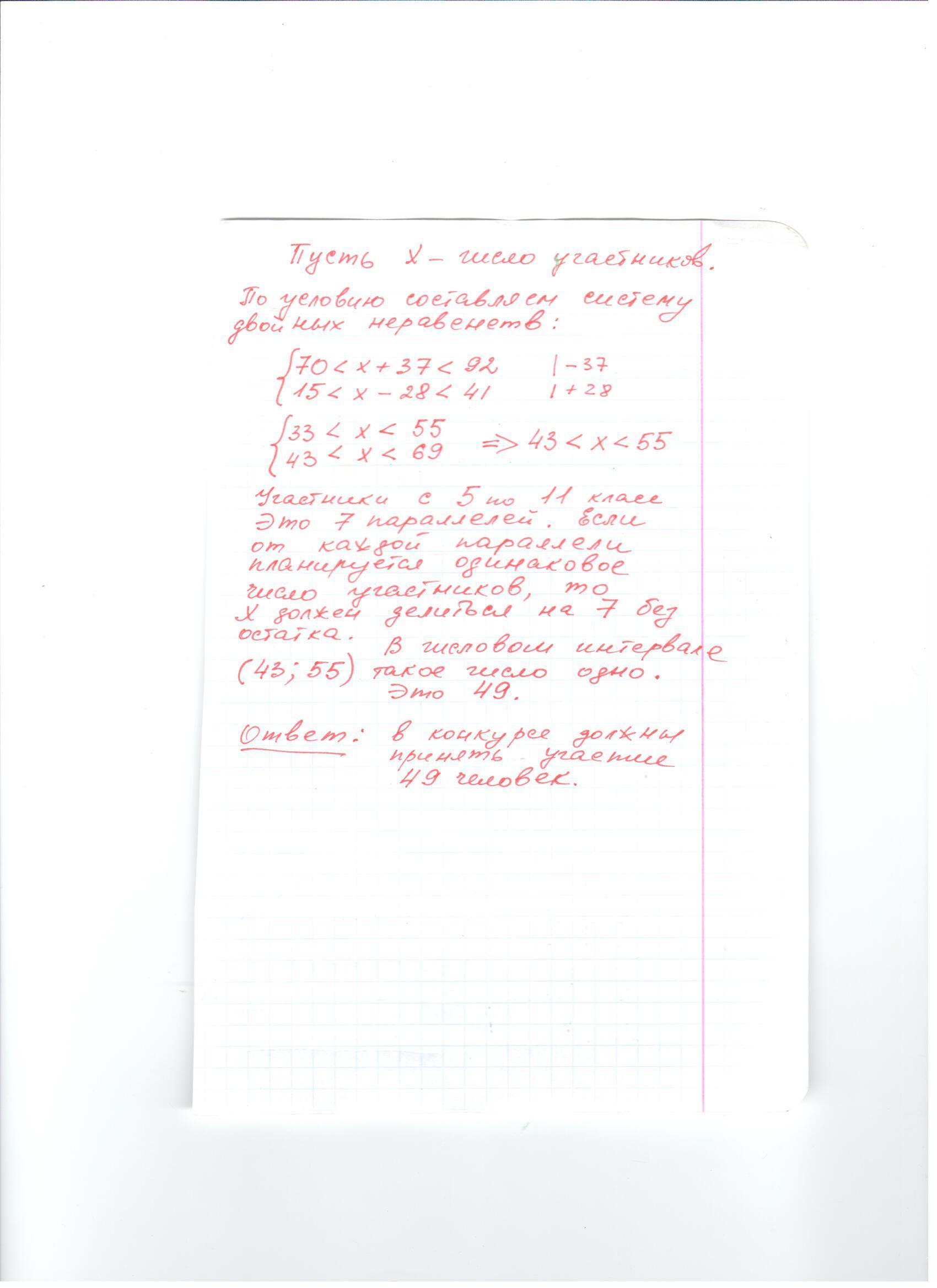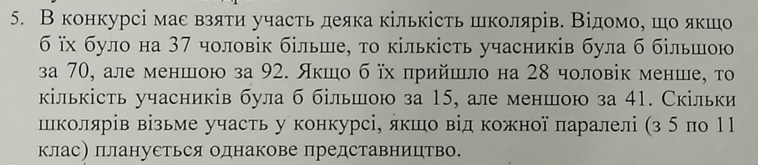 В конкурсе должны взять участие некоторое количество школьников. Известно, что если бы их было на 37 человек больше, то количество участников было б больше 70, но меньше 92. Если бы их пришло на 28 людей меньше, то количество участников было б больше 15, но меньше 41. Сколько школьников возьмёт участие в конкурсе, если от каждой параллели (с 5 по 11 класс) планируется одинаковое представительство?