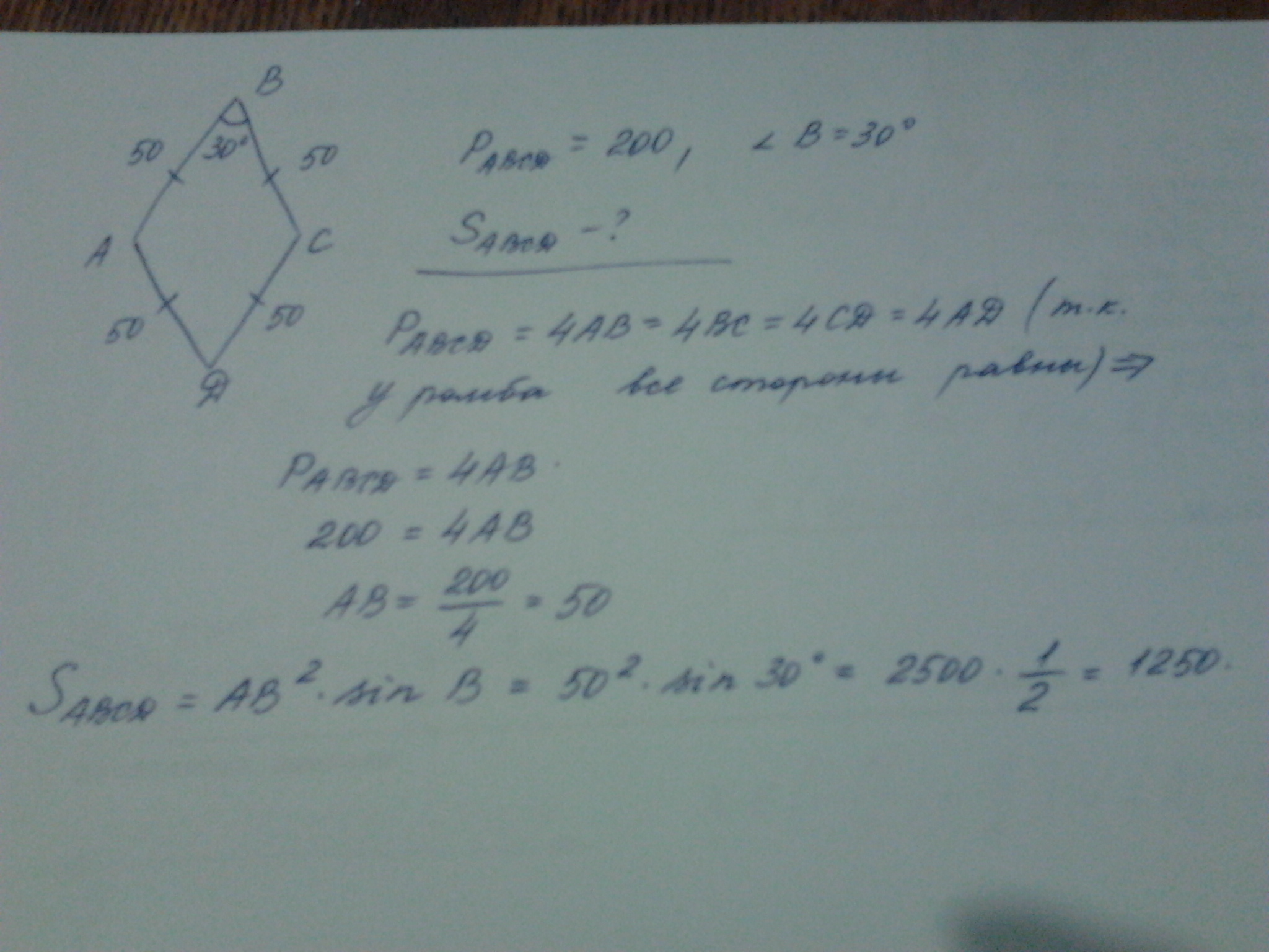 Площадь ромба - квадрат стороны на синус угла между ними.