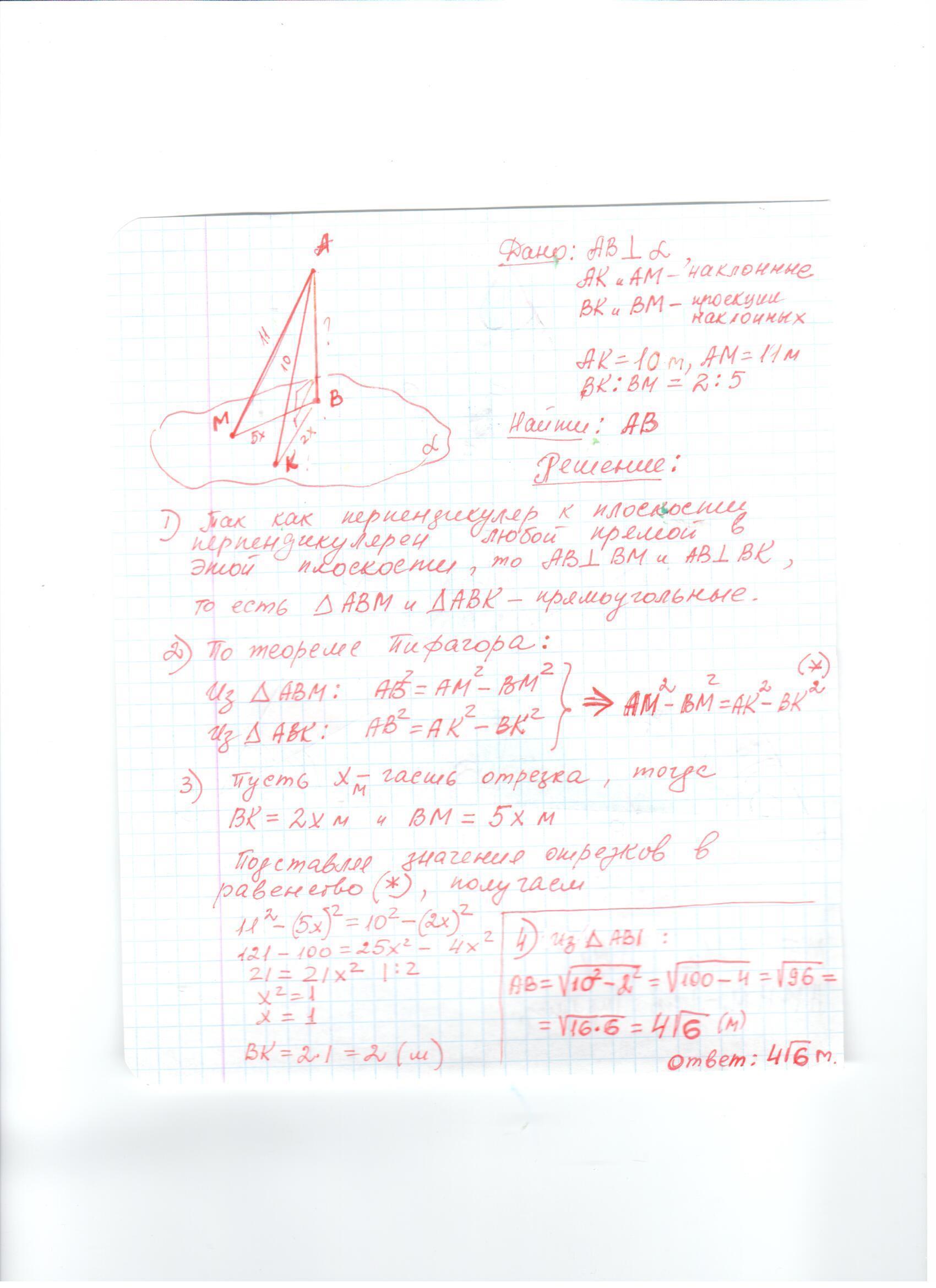 Из одной точки проведены перпендикуляр и две наклонные длины 10 м и 11 м.найдите длину перпендикуляра если проекция наклонных относятся как 2:5