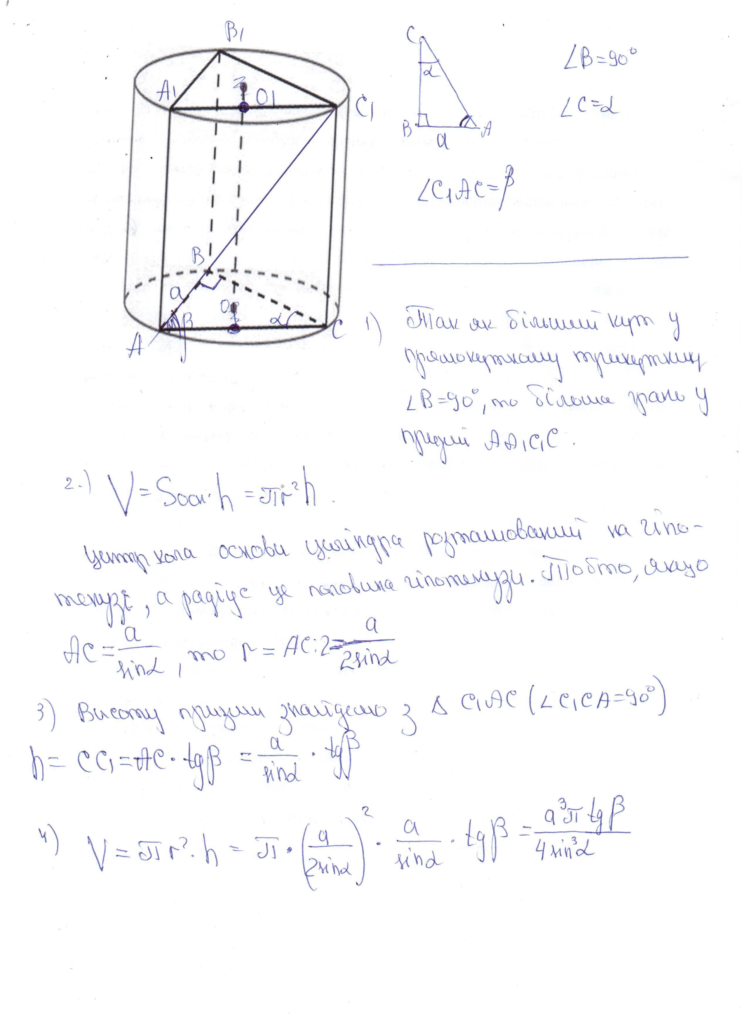 В циліндр вписана пряма призма в основі якої лежить прямокутній трикутник з кутом α і протилежним цьому куту катетом а. Визначити об'єм циліндра, якщо діагональ більшої грані призми утворює з площиною основи кут β