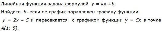 1. Если график у=кх+b пересекается с другим графиком в точке А(1; 5), то координаты точки А превращают график в верное равенство. Следовательно поставляем их вместо х и у