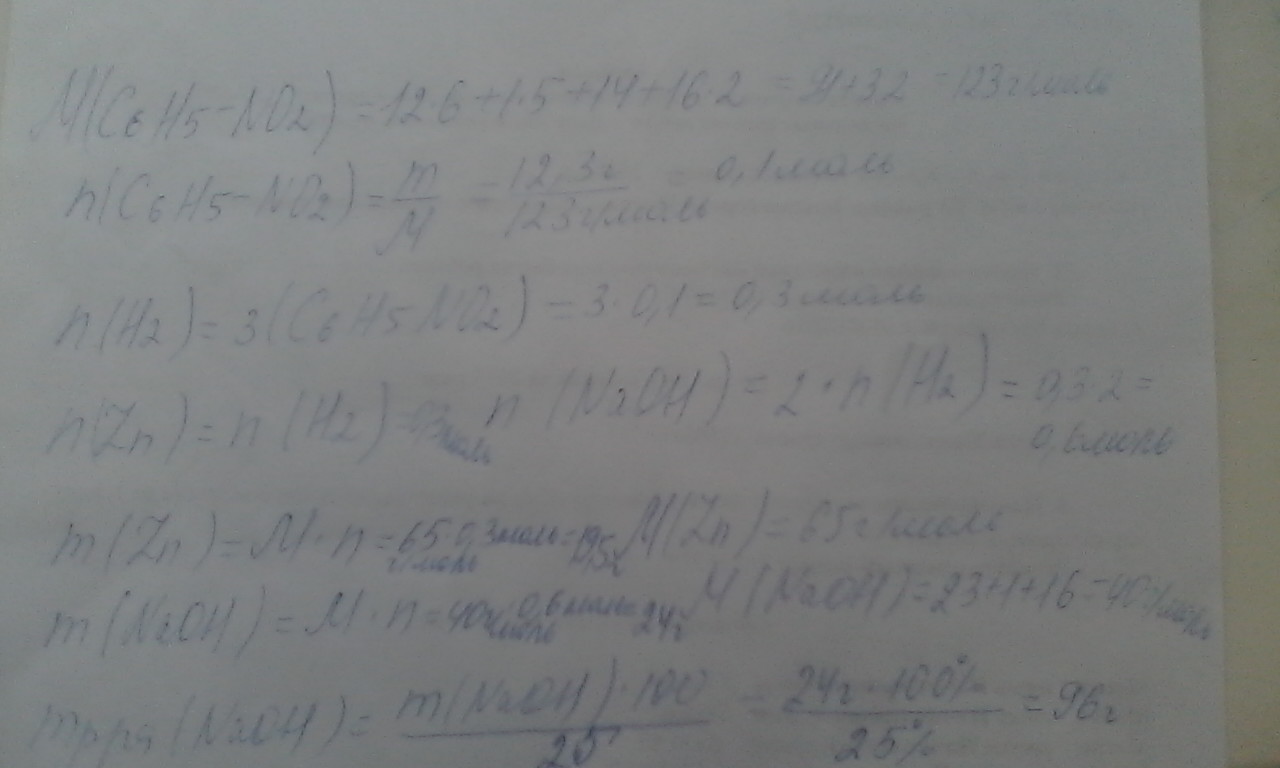 Какую массу цинка и объем 25%-ного раствора гидроксида натрия (ρ=1,26 г/см³) нужно взять, чтобы полученным водородом полностью восстановить12,3 г нитробензола до анилина?