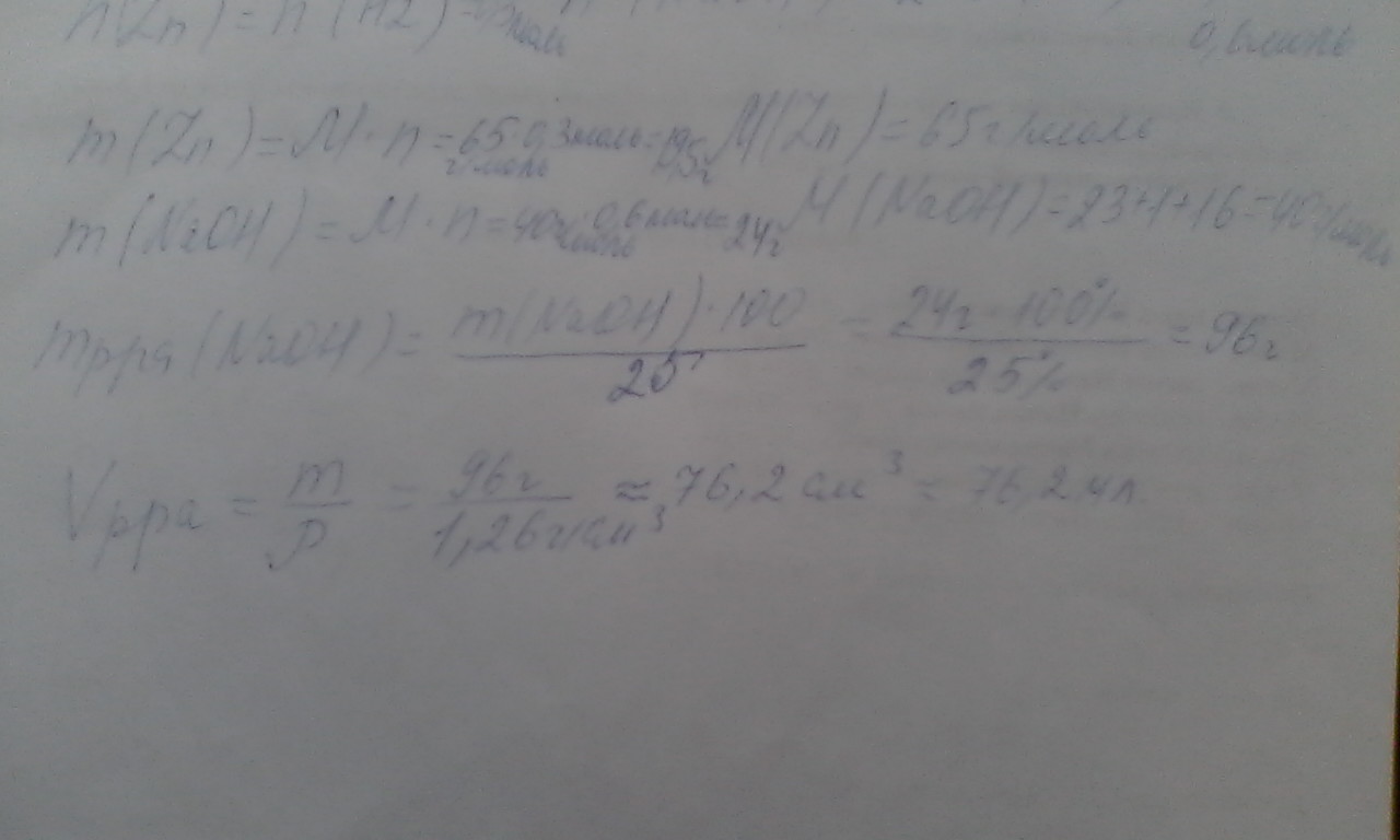Находите количество вещества нитробензола для этого массу нитробензола делите на молярную массу. Дальше по уравнению соотносите количество моль. Находите количество вещества Н2 а от туда уже количество вещества цинка и гидроксида натрия. Далее исходя из количества вещества и молярной массы находите массу веществ. Далее из массы гидроксида и % содержания гидроксида находите массу раствора. Далее массу делим на плотность получаем обьем.