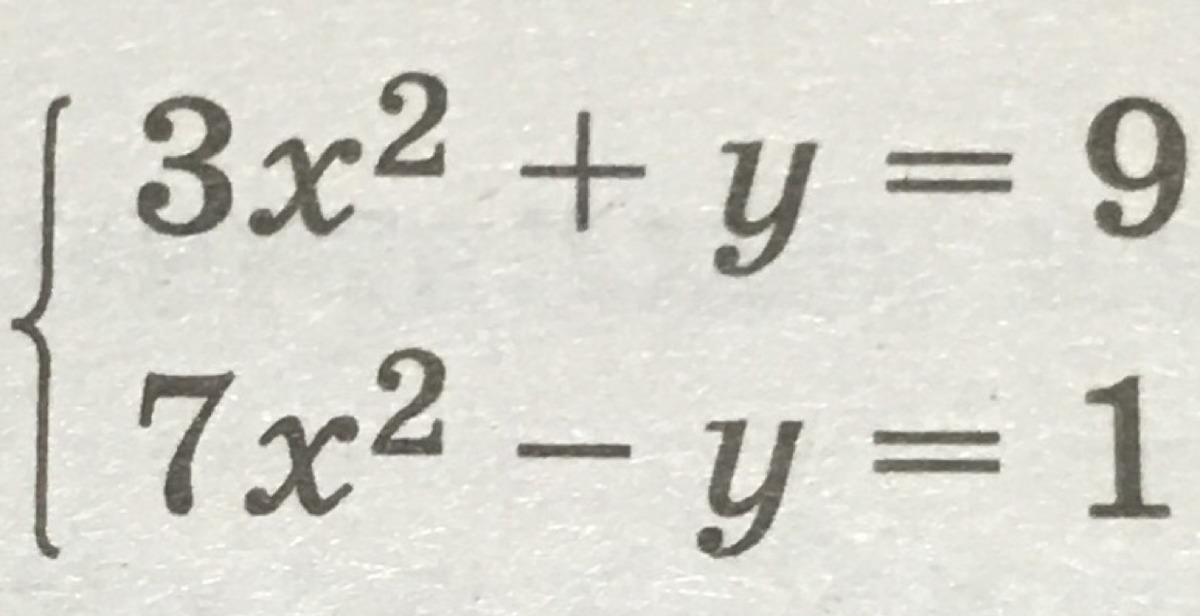 7x^2-y=1 сложим 10x^2=10 10x^2-10=0 x^2-1=0 (x-1)(x+1)=0 x=1 x=-1