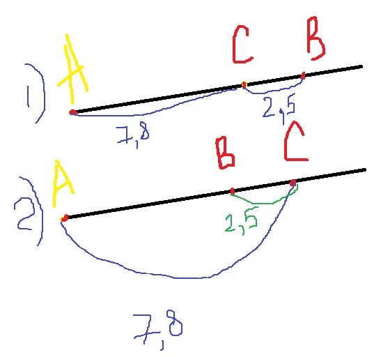 в первом случае точка С лежит ближе к точке А, чем точка В лежит к точке А. в таком случае отрезок АВ равен сумме отрезков АС и СВ,АВ= 7,8+2,5=10.3