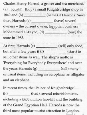 1What did Harrod buy in 1849? 2Did he name it Harrods or Simpsons? 3Was Harrod a grocer or a baker? 4 At first,Harrods sold only food,didn't it? 5Did it sell other items after a few years? 6What is the shop's motto? 7Did Harrods sell aeroplanes? 8What unusual items did the shop sell? 9Where is Harrods situated? 10Harrods is the third most popular tourist attraction,isn't it?