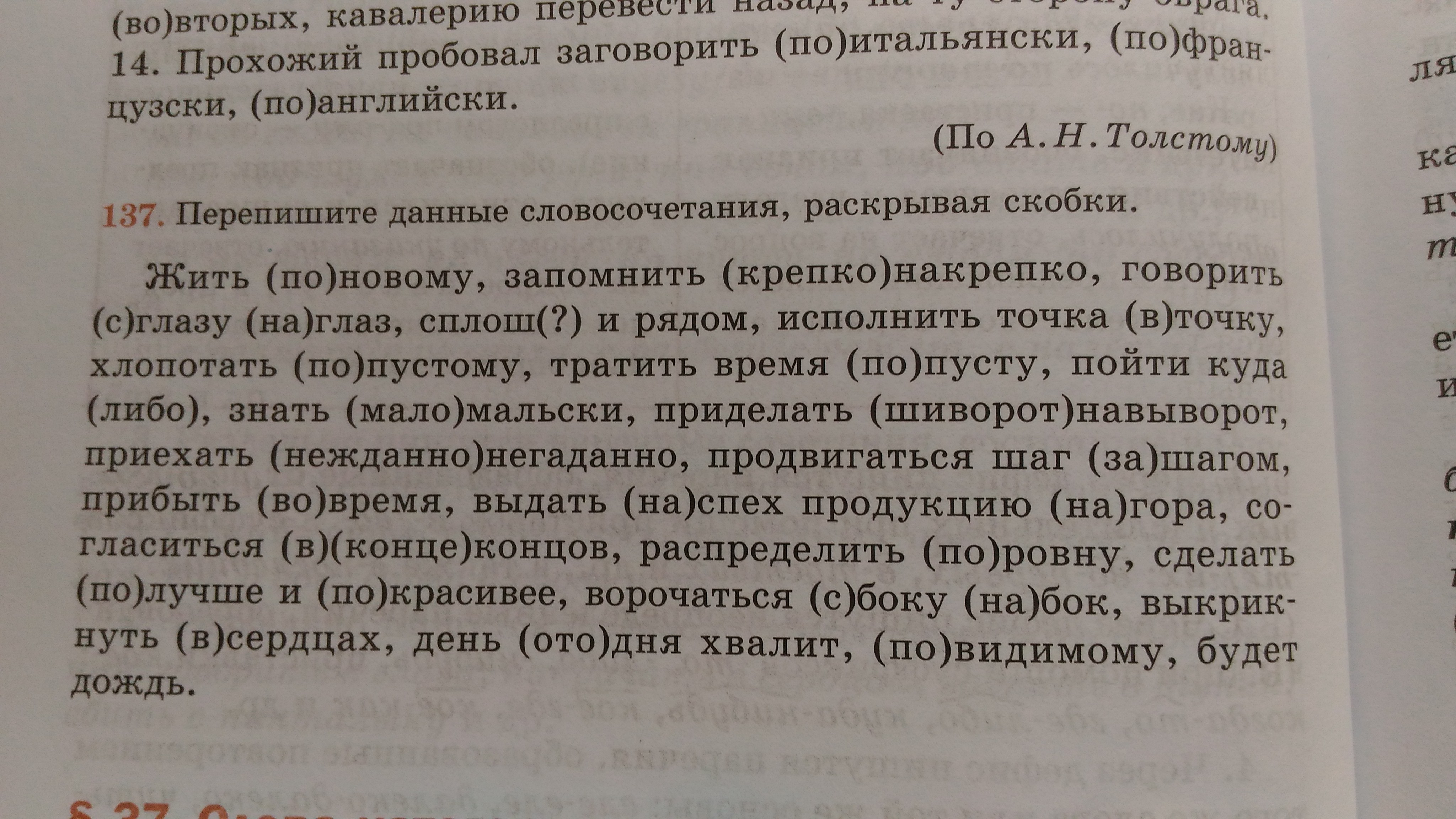 Жить по-новому, запомнить крепко-накрепко, говорить с глазу на глаз, сплошь и рядом, исполнить точка в точку, хлопотать по-пустому, тратить время попусту, пойти куда-либо, знать мало-мальски, приделать шиворот навыворот, приехать нежданно-негаданно, продвигаться шаг за шагом, прибыть вовремя, выдать наспех продукцию нагора, согласится в конце концов, распределить поровну, сделать получше и покрасивее, ворочаться с боку на бок, выкрекнуть в сердцах, день ото дня хвалит, по-видимому, будет дождь