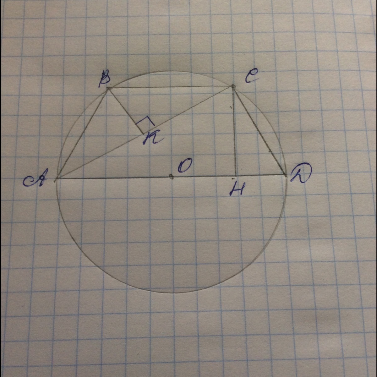 В окружность (r=4см) вписана трапеция; угол BCA = 30, угол BAC=углy CAD. Найдите площадь трапеции.