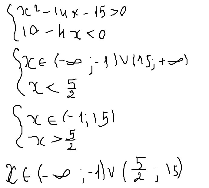 2) x²-14x-15 <0 при х от -1 до 15. 10-4x <0 при х>2,5. В итоге х от 2,5 до 15.
