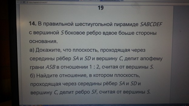 МАТЕМАТИКА С2 Профиль. Помогите, пожалуйста, сделать правильный чертеж. ТОЛЬКО ЧЕРТЕЖ, без решения. У меня не получается сделать так, чтобы плоскость делила апофему грани ASB в отношении 1:2, считая сверху