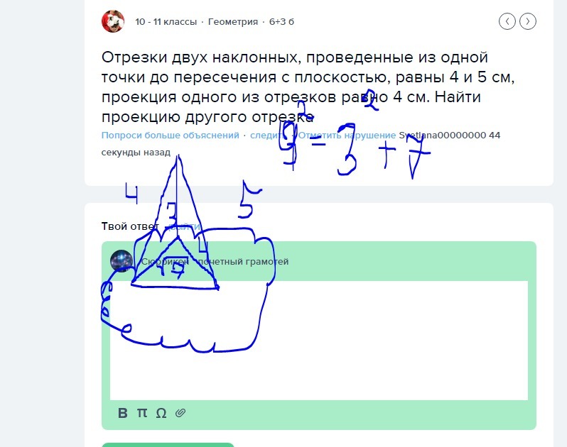 Отрезки двух наклонных, проведенные из одной точки до пересечения с плоскостью, равны 4 и 5 см, проекция одного из отрезков равно 4 см. Найти проекцию другого отрезка
