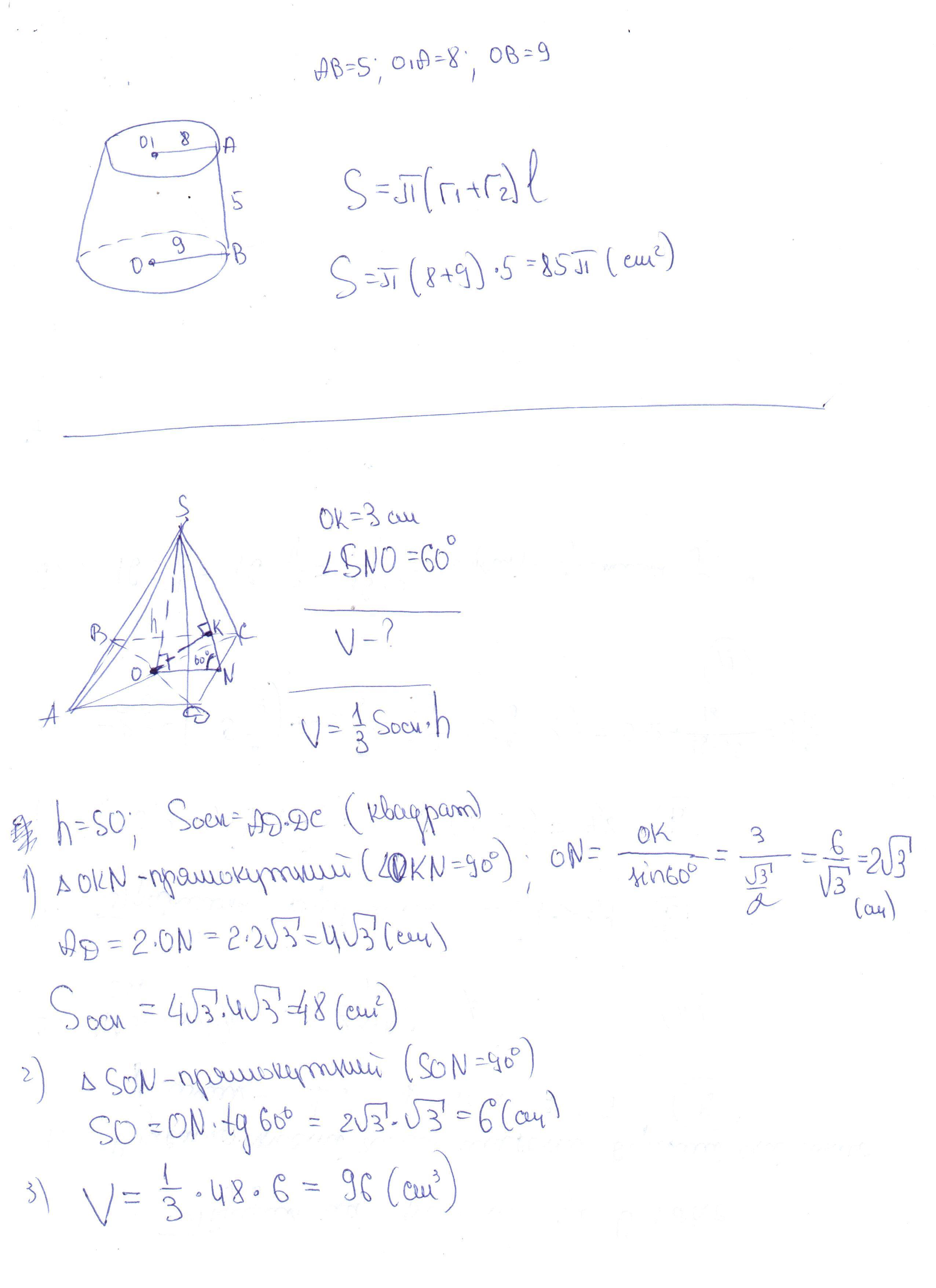 1. Радіуси основ зрізаного конуса дорівнюють 8 см і 9 см, а його твірна - 5 см. Знайти площу бічної поверхні конуса.
