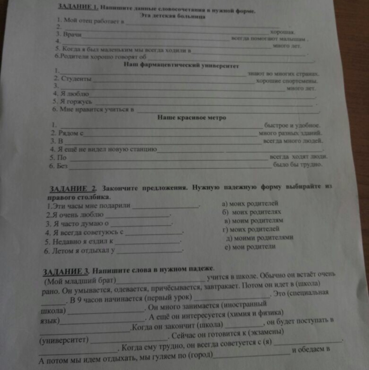 Задание 3. Мой младший брат учится в школе;Потом он идет в школу; В 9 часов начинается первый урок; Это специальная школа; Он много занимается иностранным языком; А еще он интересуется химией и физикой; Когда он закончит школу, он будет поступать в университет; Сейчас он готовится к экзаменам; Когда ему трудно, он всегда советуется со мной; А потом мы идем отдыхать по городу и обедаем в...(дальше не сфоткала)