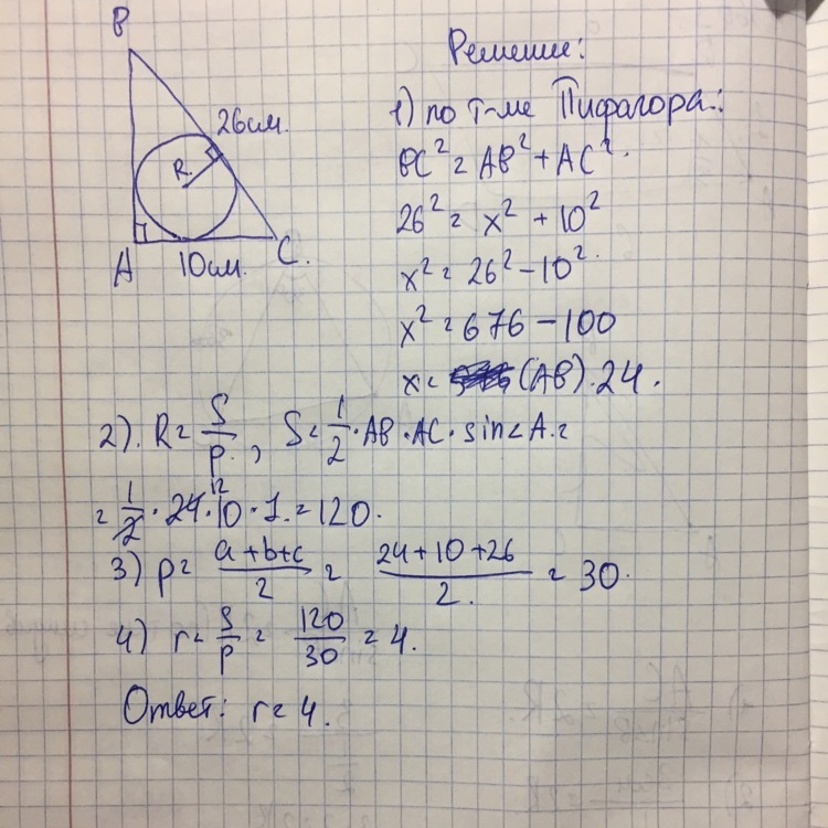катет и гипотенуза прямоугольного треугольника соответственно равны 10 см и 26 см .найдите радиус вписанной окружности. помогите пожалуйста,очень надо!