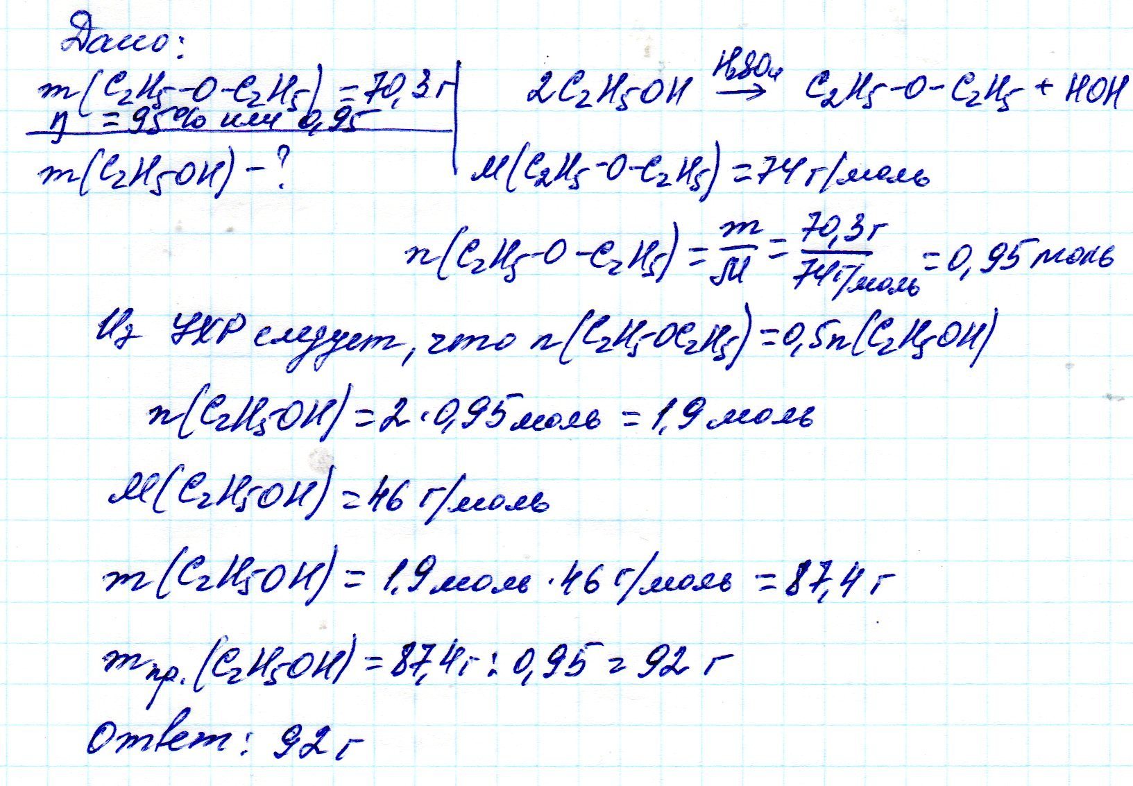 Сколько г этилового спирта нужно затратить чтобы получить 70.3 г диэтилового эфира если массовая доля выхода продукта реакции составляет 95% от теоретической возможного ?