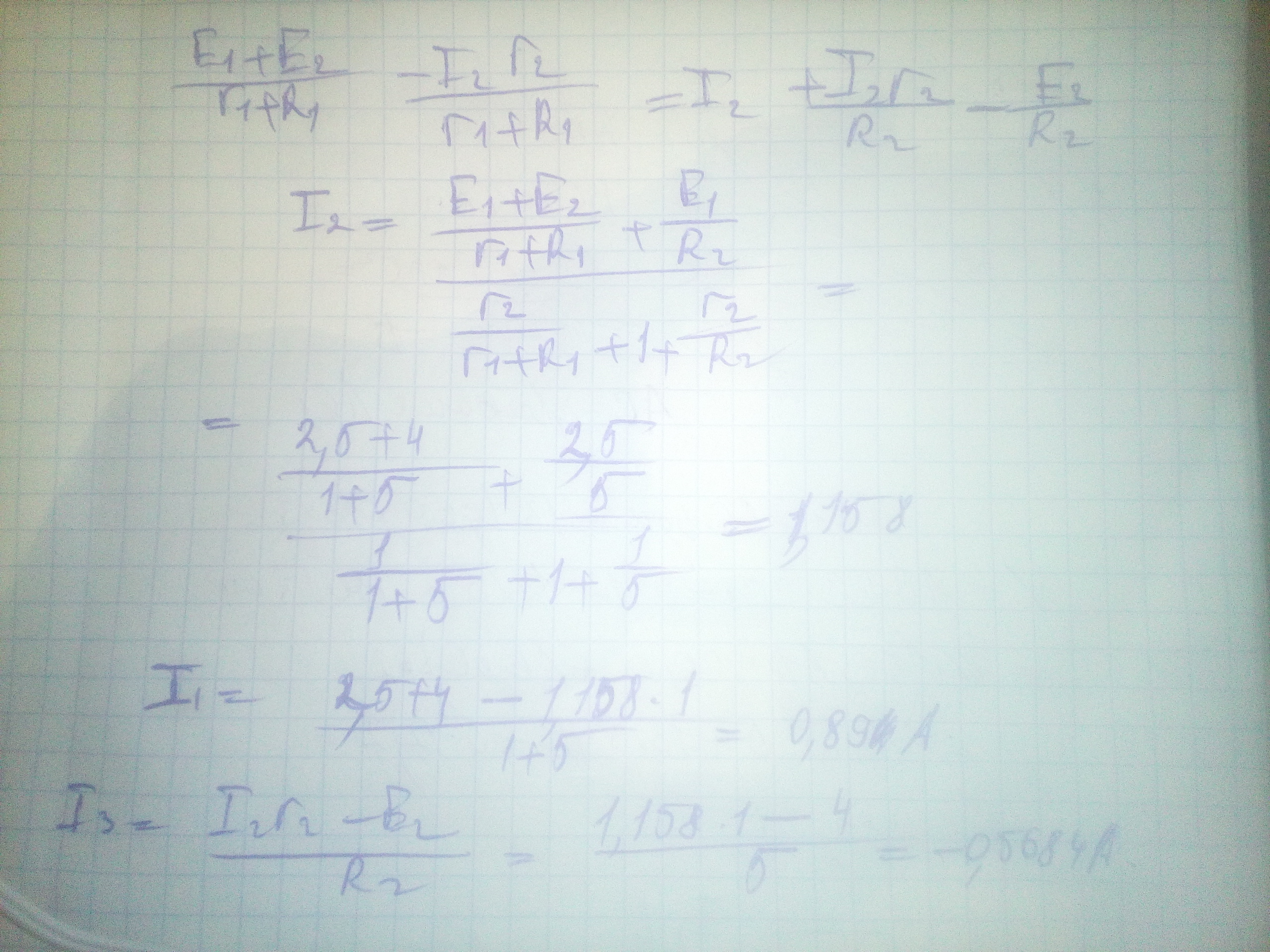E1=2.5в E2=4в R1=5 Ом R2=5Ом r1=1 Ом r2= 1 Ом