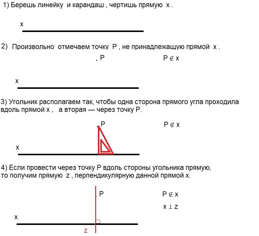 начертите прямую x.отметьте на чертеже точку p,не лежащую на этой прямой.С помощью чертежного угольника проведите через точку P прямую,перпендикулярно прямой X.
