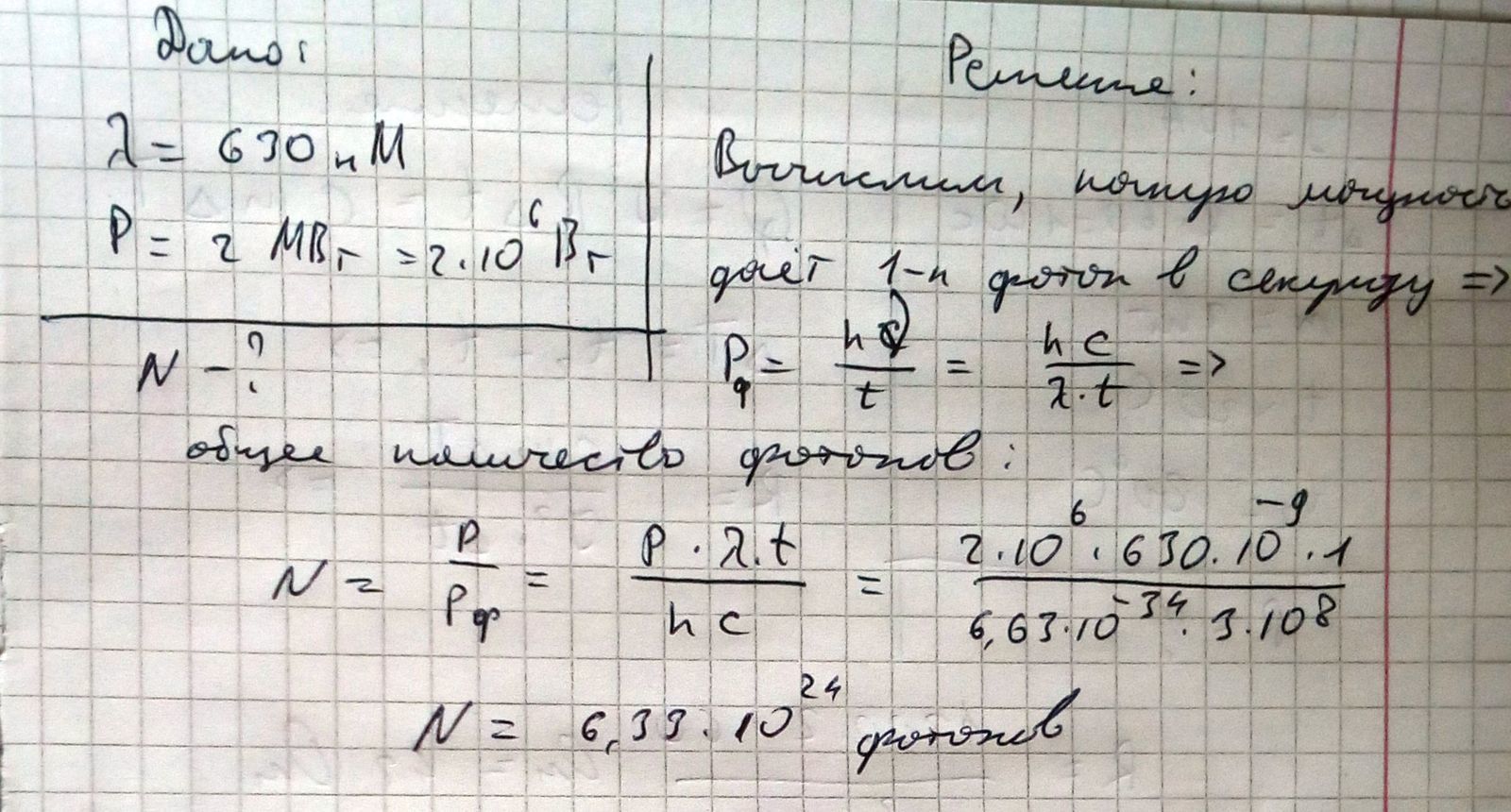 Гелій неоновой лазер безперервно випромінює світло з довжиною хвилі 630 нм. Скільки фотонів випромінює лазер за одну секунду якщо його потужність дорівнювала 2,0