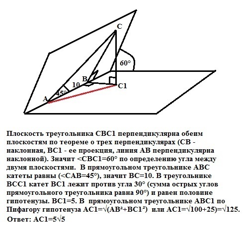 Помогите пожалуйста решить 2 задачу. Поняла, что треугольник АВС прямоугольный и равнобедренный, угол САВ= АСВ= 45 градусов, следовательно АВ=СВ=10, а вот что дальше, как найти АС1