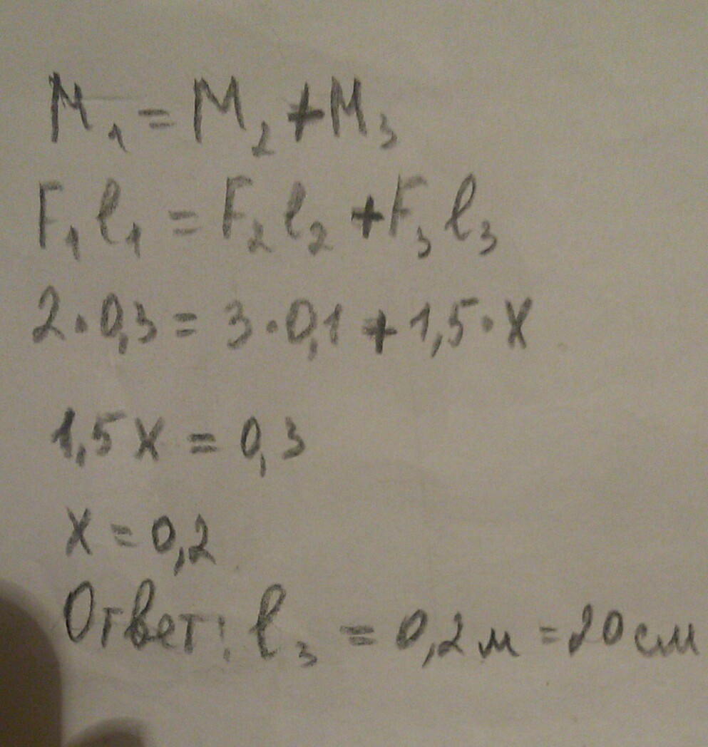 СРОЧНО!!! Умоляю! Пожалуйста, помогите! Нужно подробное решение! Задача по физике: На рычаг, находящийся в равновесии, действуют силы F1=2Н, F2=3Н, F3=1,5Н. Найдите плечо третьей силы l3, если плечи 1 и 2 сил равны l1=30см, l2=10см.