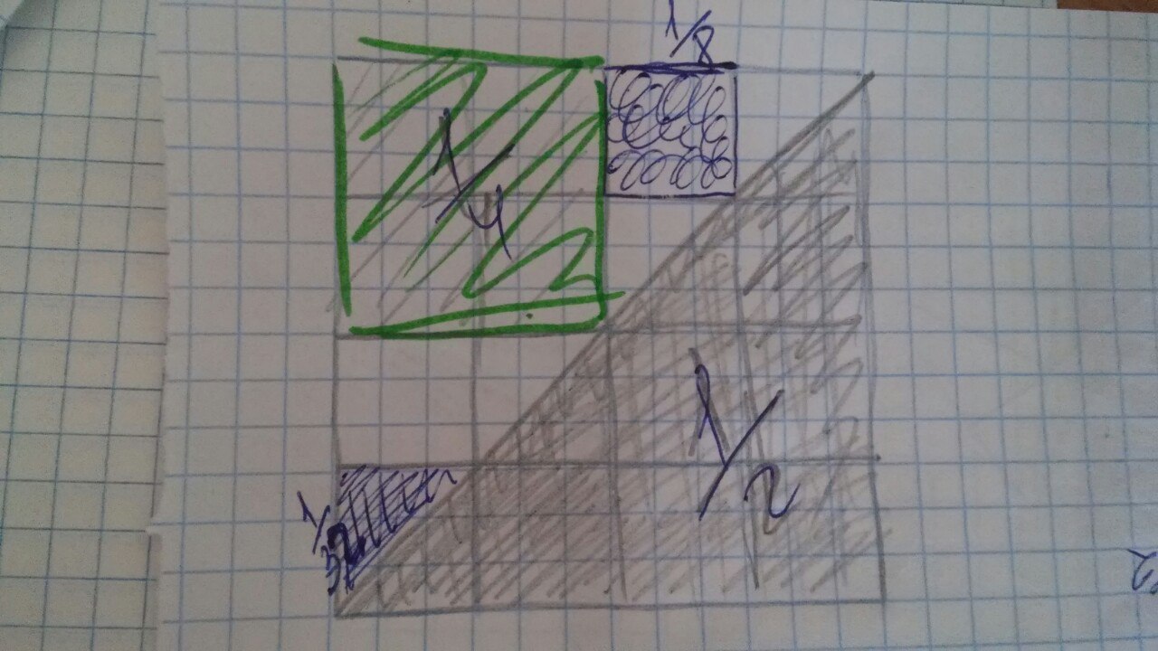 Нарисуй квадрат со стороной 6 см. Раздели его на 32 равные части. Придумай, как закрасить на рисунке в разные цвета 1/2, 1/4, 1/16, 1/32 площади квадрата.