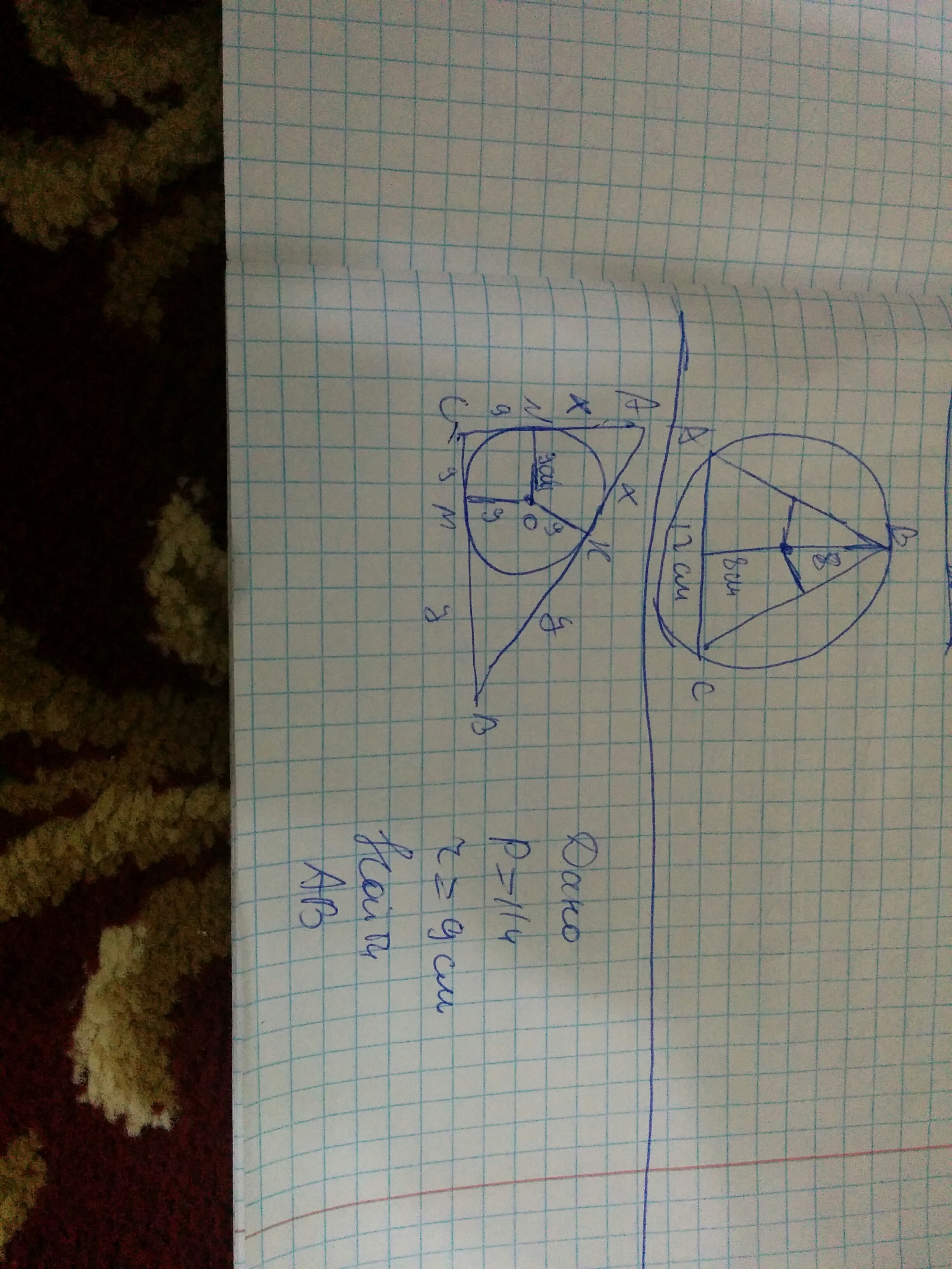 1) В прямоугольный треугольник вписана окружность. Найдите гипотенузу треугольника, если радиус окружности равен 9 см, а периметр треугольника равен 114 см.