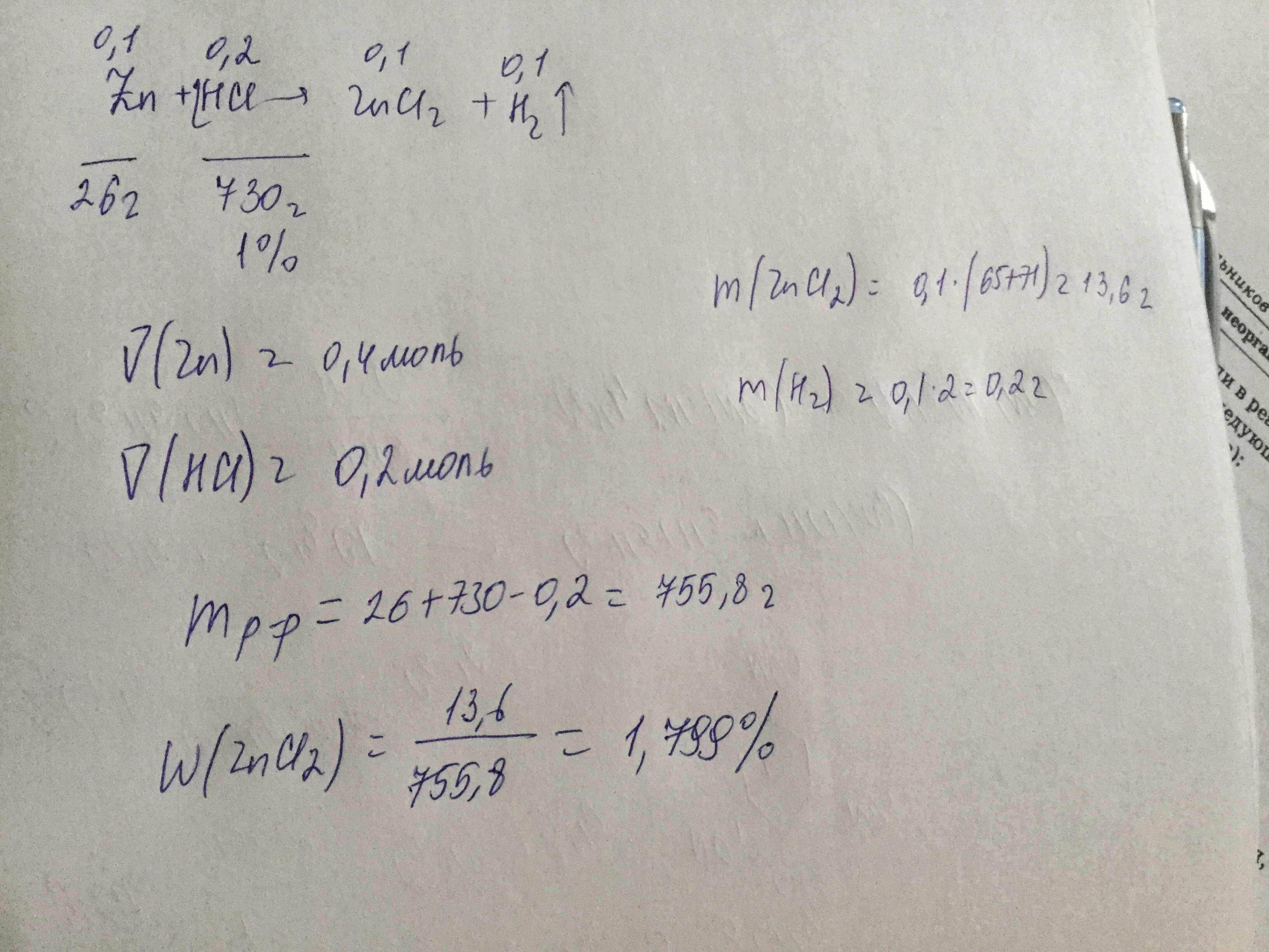 К 26 граммам цинковой стружки прилили 730 грамм( 1% )раствора соляной кислоты вопрос-расчитайте массу соли в растворе после окончания. реакции