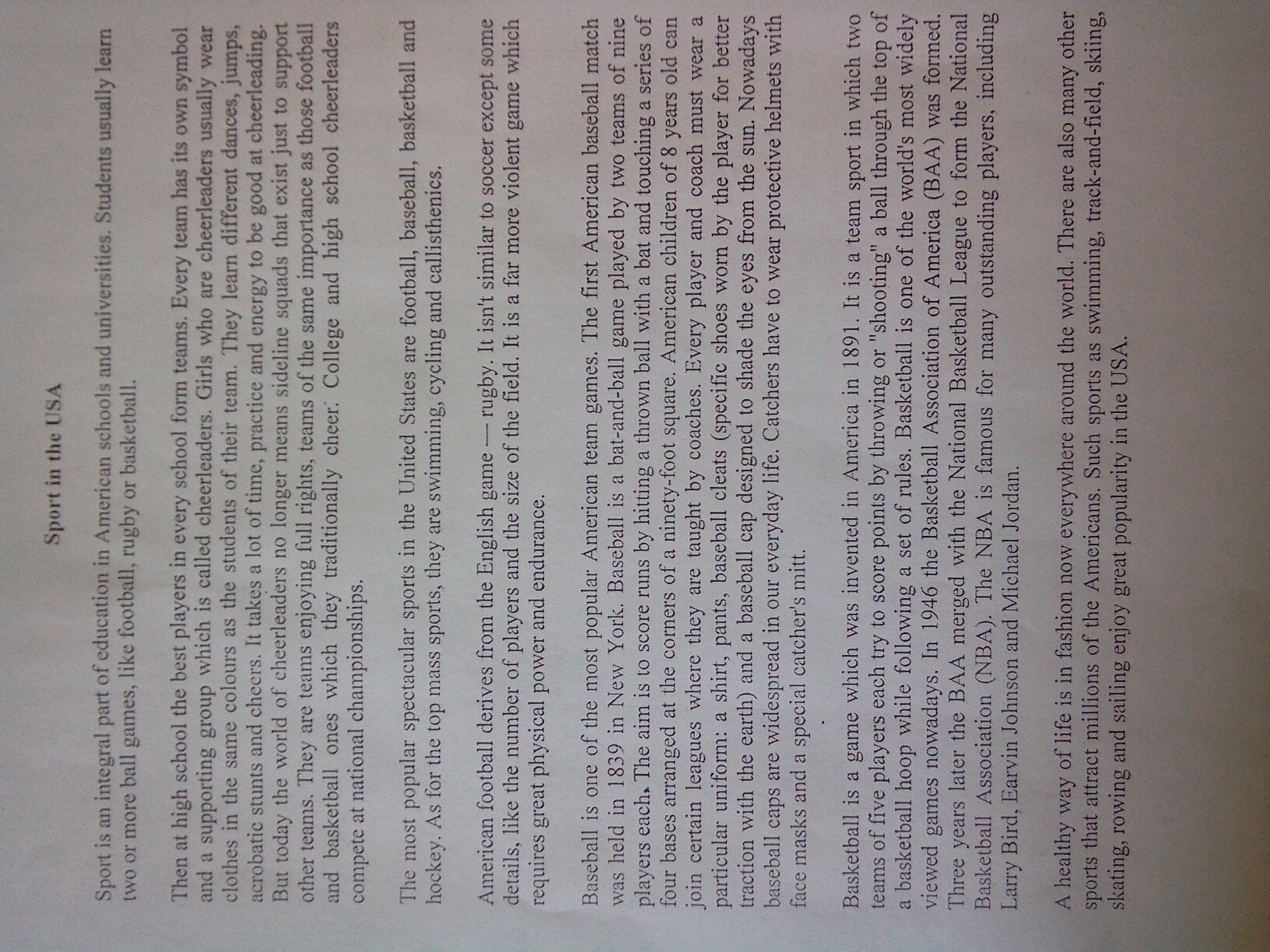 Спорт в Соединённых Штатах Америки является неотъемлемой частью обучения в школе или университете. Наиболее популярные спортивные командные игры — американский футбол, регби, баскетбол и волейбол.В старшей школе формируются команды из лучших игроков. У каждой команды есть своя эмблема и группа поддержки, которая носит название «чирлидеры». Девушки из группы чирлидеров обычно носят одежду того же цвета, что и форма игроков их команды. Они разучивают множество разных танцев, прыжков, акробатических трюков и «кричалок». Для того чтобы стать чирлидером, необходимо тратить много времени и энергии на тренировки. В настоящее время чирлидеры являются командами, которые существуют не только для поддержки других команд. Это полноправные участники матча, наряду со спортивными командами, которых чирлидеры обычно поддерживают. Чирлидеры из разных школ и университетов обычно соперничают на национальных чемпионатах.Виды спорта, которые вызывают наибольшие зрительские симпатии, — это американский футбол, бейсбол, баскетбол и хоккей. Если говорить о массовых видах спорта, то это плавание, езда на велосипеде и ритмическая гимнастика.Американский футбол очень похож на регби. Он не имеет ничего общего с обычным футболом (который в США носит название «соккер»), за исключением таких деталей, как количество игроков и размер поля. Это весьма агрессивная игра, которая требует от её участников большой физической силы и мужества.Бейсбол — одна из самых популярных командных спортивных игр в Америке. Первый матч по бейсболу был проведён в 1839 г. в Нью-Йорке. Бейсбол — это игра с мячом и битой, в которой участвуют две команды. В каждой команде — 9 игроков. Цель игры — набрать наибольшее количество очков, отбивая брошенный мяч битой и касаясь четырёх баз, расположенных по углам площадки размером 175 х 125 метров. В США дети в возрасте 8 лет могут войти в состав лиги, где будут обучаться игре под руководством тренера. Все игроки и тренеры должны носить специальную форму — рубашку, бриджи, бейсбольные ботинки, которые создают дополнительное сцепление с землёй, и кепку-бейсболку, защищающую глаза от солнечных лучей. (Многие стали носить бейсболки и в повседневной жизни.) Игроки, которые ловят мяч, должны надевать на игру защитные шлемы с масками и специальную бейсбольную перчатку.Баскетбол — игра, придуманная в Америке в 1891 г. Это игра между двумя командами из пяти игроков, которые набирают очки путём забрасывания мяча в баскетбольное кольцо, следуя определённым правилам. Баскетбол — одна из наиболее любимых зрителями игр современности. В 1946 г. была сформирована Американская баскетбольная ассоциация (АБА). Спустя 3 года она объединилась с Национальной баскетбольной лигой и стала называться Национальной баскетбольной ассоциацией (НБА). НБА прославили многие знаменитые игроки, среди которых особо выделялись Ларри Бёрд, Ирвин Джонсон и Майкл Джордан.Здоровый образ жизни вошёл в моду во всём мире. Миллионы американцев занимаются самыми различными видами спорта. Наибольшей популярностью пользуются плавание, лёгкая атлетика, гребля, конькобежный, лыжный и парусный спорт.