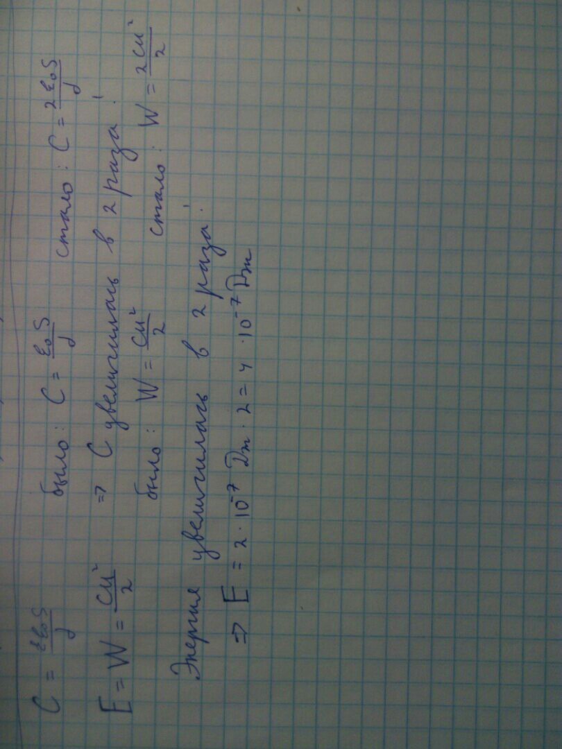 Энергия плоского воздушного конденсатора 2 • 10-7 Дж. Определите энергию конденсатора после заполнения его диэлектриком с диэлектрической проницаемостью e = 2, если конденсатор подключен к источнику питания.