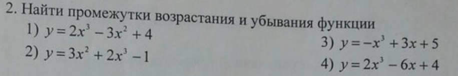 Нужно найти промежутки возрастания и убывания функции. Буду рад, если поможете хотя-бы с одним-двумя заданиями , для примера.