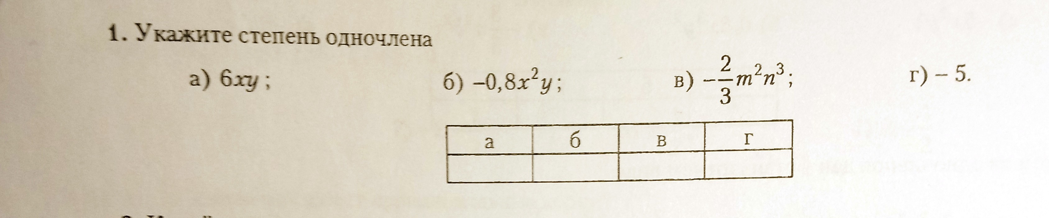 г) -5 не содержит переменных, поэтому, степень этого одночлена равна нулю.