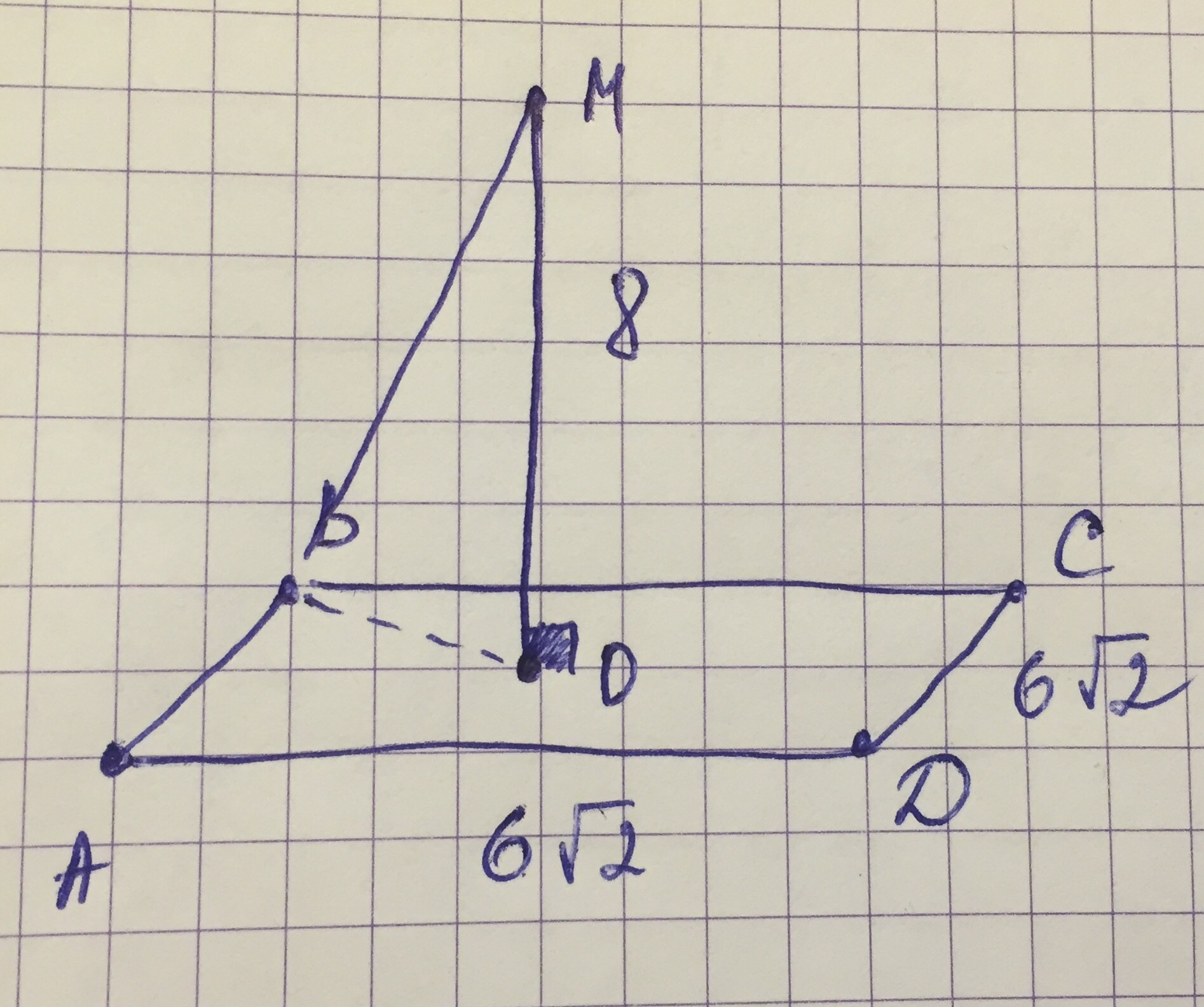 Точка М не лежит в плоскости прямоугольника АВСД. Отрезок ОМ перпендикулярен плоскости прямоугольника и равен 8 см. Найдите расстояние от точки М до вершины прямоугольника В, если стороны прямоугольника равны 6 корней из 2 и 6 корней из 2