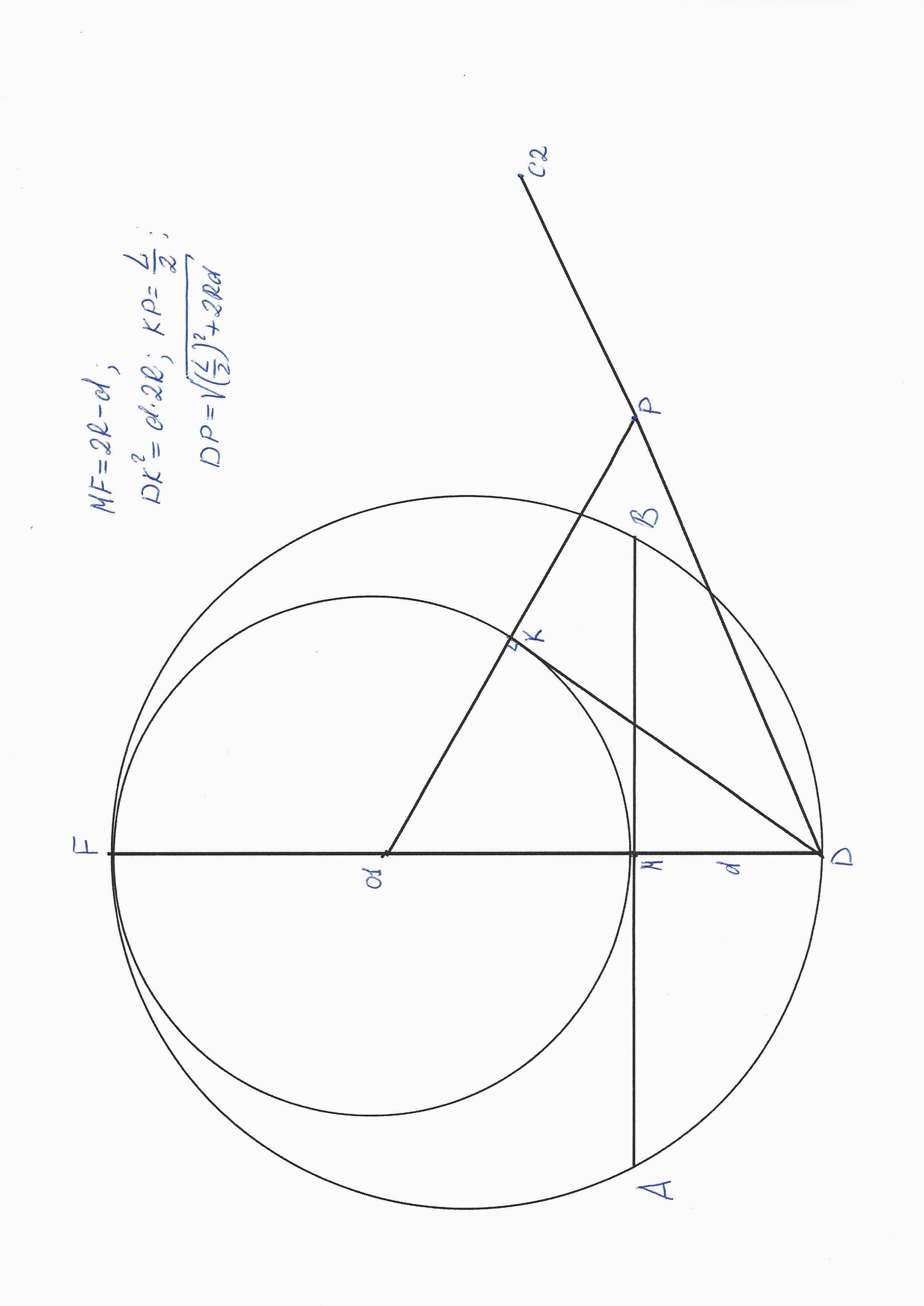 3) диаметр DF через середину AB - точку M; обозначу DM = d;