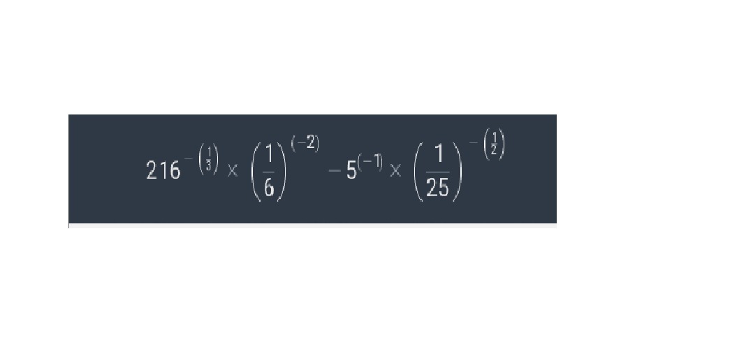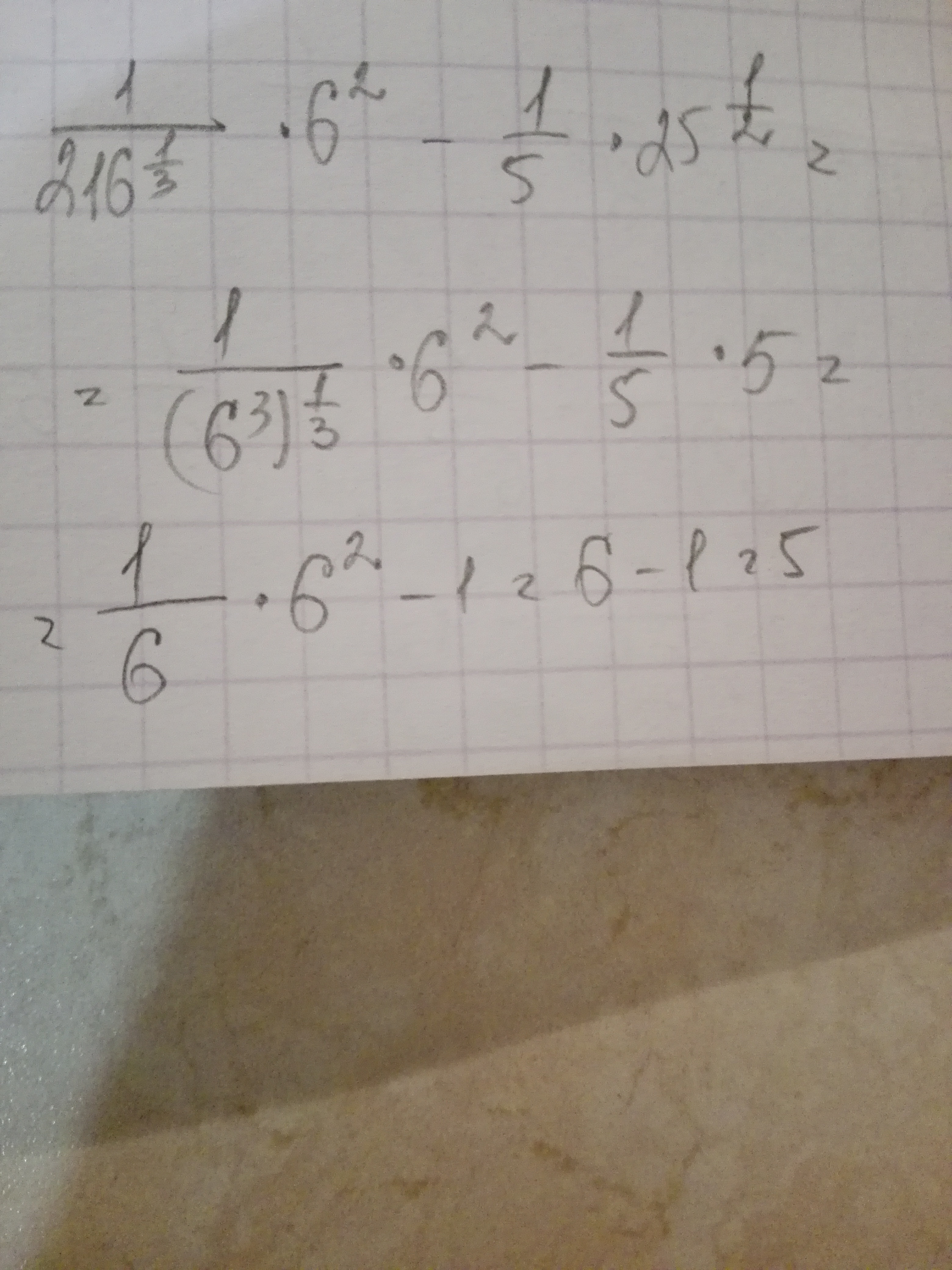 216^-1/3*(1/6)^-2-5^-1*1/25^(-1/2)=1/∛216*1/36-1/5*625=1/216-125=-124 215/216