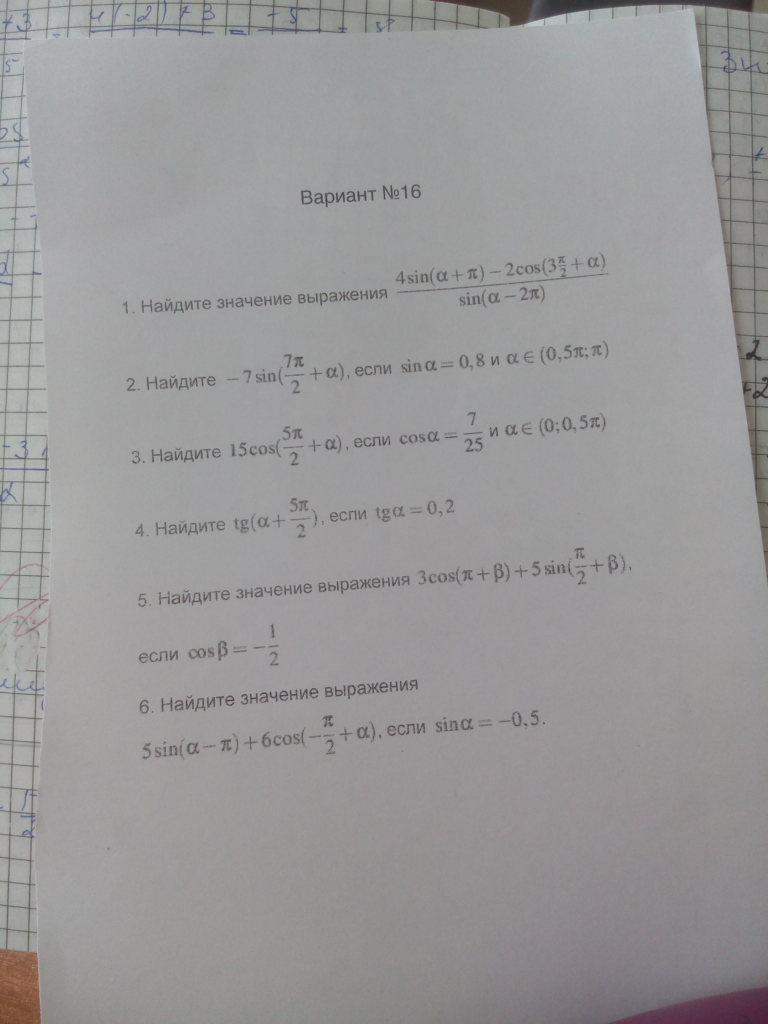 6) 5sin( \alpha - \pi )+6cos(- \frac{ \pi }{2}+ \alpha )=5sin \alpha -6sin \alpha =-sin \alpha =0,5.