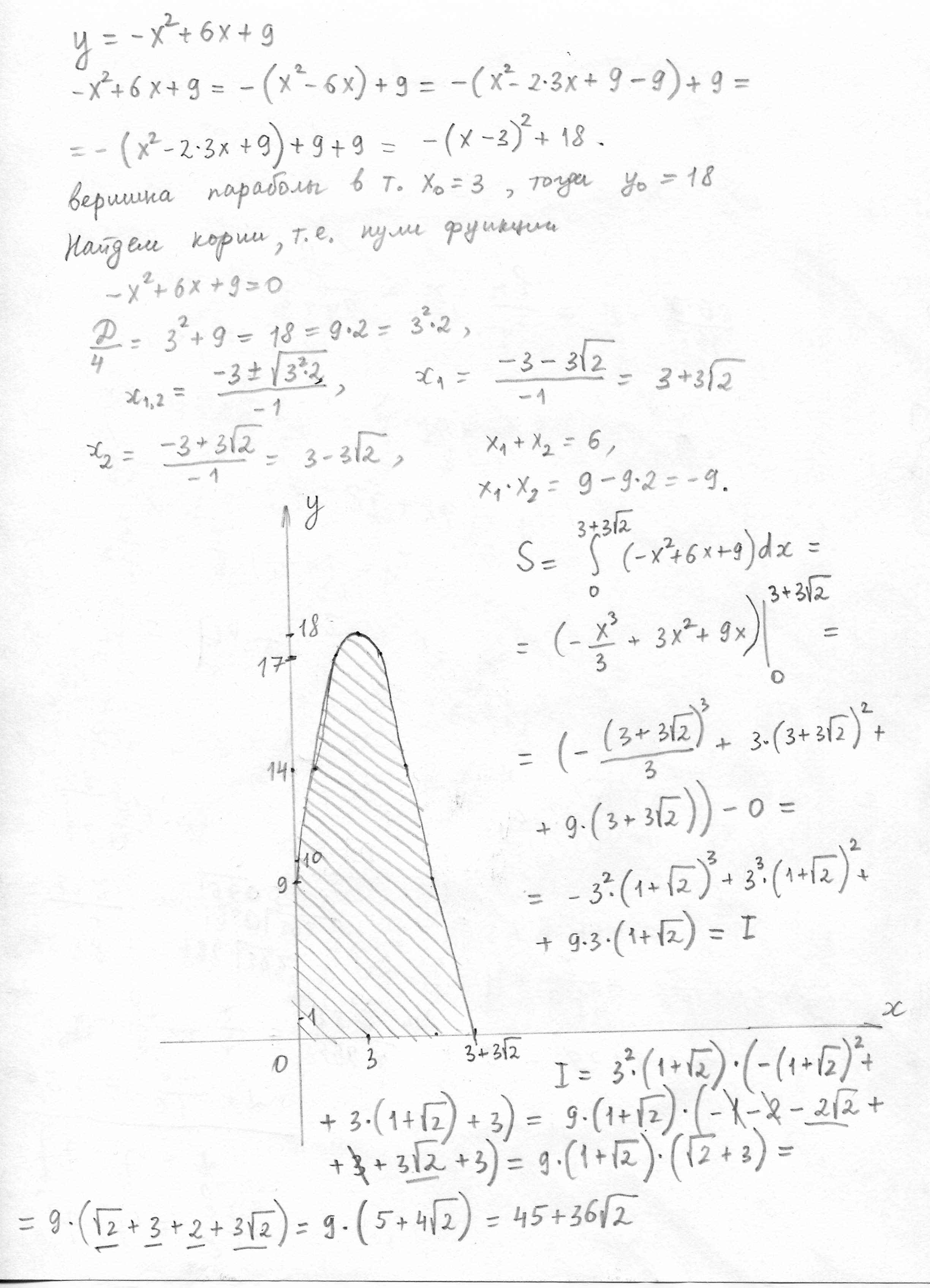 Помогите плиз! найдите площадь фигуры,ограниченной графиком функции y= -x^2+6x+9 и осями координат если можно то с прирепленой фотографией решения