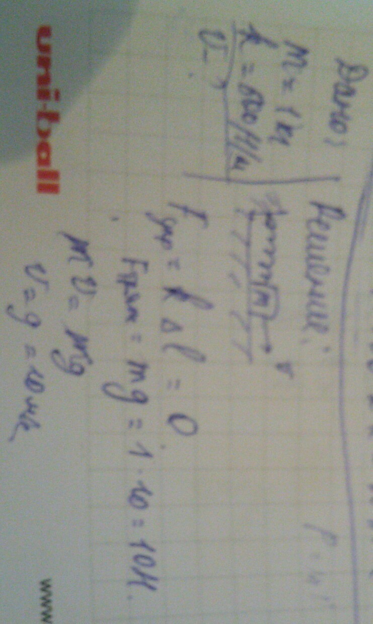 Один конец сжатой и связанной нитью пружины прикреплён к стене, а другой касается бруска, лежащего на гладкой поверхности. Масса бруска m=1кг, жесткость пружины k=500 Н/м. Определите скорость движения бруска после пережигания нити