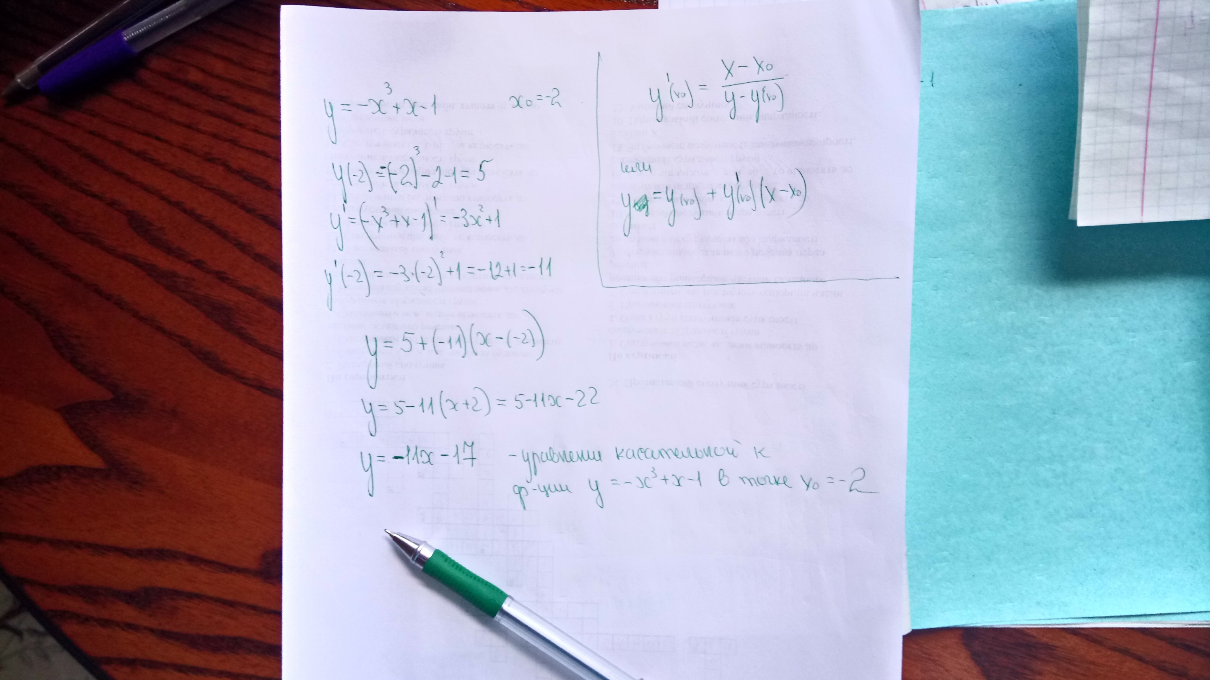 Пожалуйста!напишите уравнение касательной к графику функции y= -x^3+x-1 в точке графика с абсцитссой X0=-2.Если можно то с фотографией решения.
