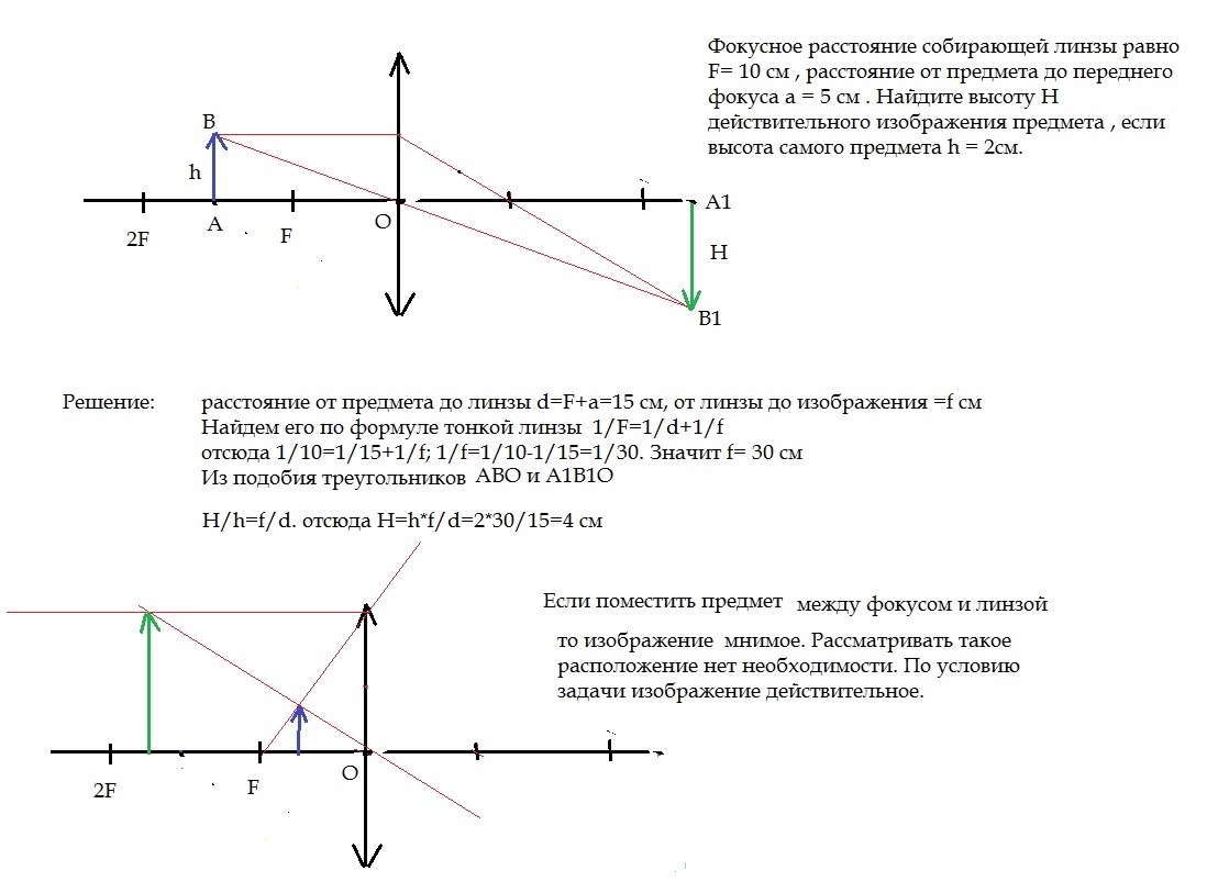 Фокусное расстояние собирающей линзы равно F= 10 см , расстояние от предмета до переднего фокуса a = 5 см . Найдите высоту H действительного изображения предмета , если высота самого предмета h = 2см.
