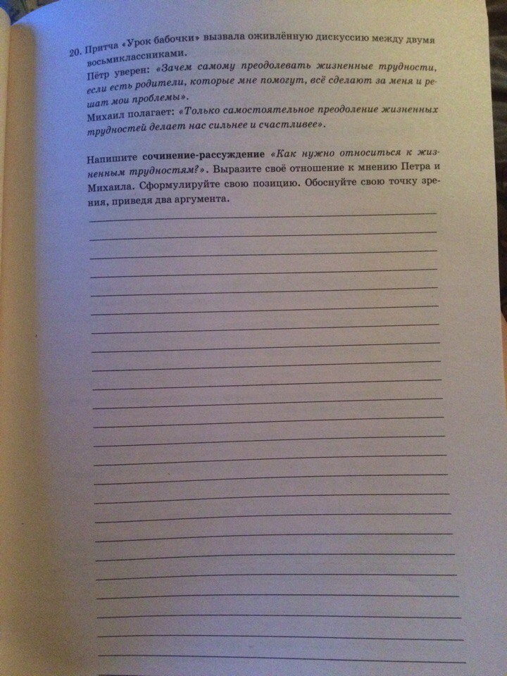 Я абсолютно согласен/согласна с мнением Михаила, который полагает, что лишь самостоятельно преодолевая трудности мы становимся сильнее и счастливее. Из диалога можно понять, что Пётр и Михаил не взрослые и самостоятельные люди, а дети или подростки. Я полагаю, чт Михаил вырастет сильным, самостоятельным и волевым человеком, потому что он с детства учится решать свои трудности самостоятельно, а не прячется за родителями, как это делает Пётр. Я думаю, что Петра самостоятельная жизнь может сломать, чего нельзя сказать о Михаиле. Я тоже стараюсь сам/сама решать свои проблемы и преодолевать трудности, ведь именно это самая главная наука в жизни для каждого человека. Её должен усвоить каждый, с самого раннего детства. Только тогда общество получит сильных, крепких, волевых и думающих людей, которые смогут привести это самое общество к расцвету. Я должен/должна стать таким человеком, потому что я хочу принести пользу обществу и стать нужным, чтобы моему примеру следовали и я мог/могла с гордостью посмотреть через несколько лет на мир людей со стержнем и характером, чтобы я мог/могла увидеть таких людей, как Михаил.