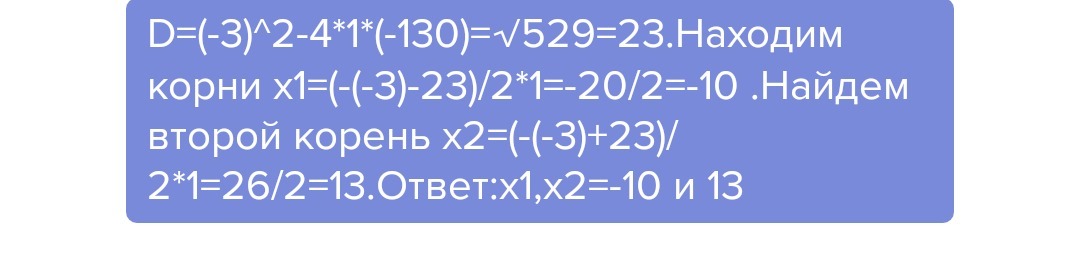 D=(-3)^2-4*1*(-130)=√529=23.Находим корни x1=(-(-3)-23)/2*1=-20/2=-10 .Найдем второй корень x2=(-(-3)+23)/2*1=26/2=13.Ответ:x1,x2=-10 и 13